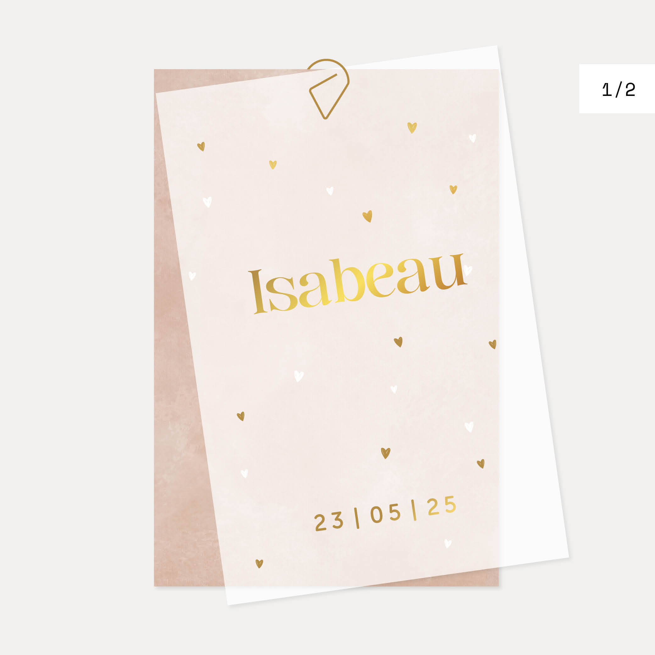 deel 1 - kalkpapier voorkant geboortekaartje Isabeau met hartjes folie