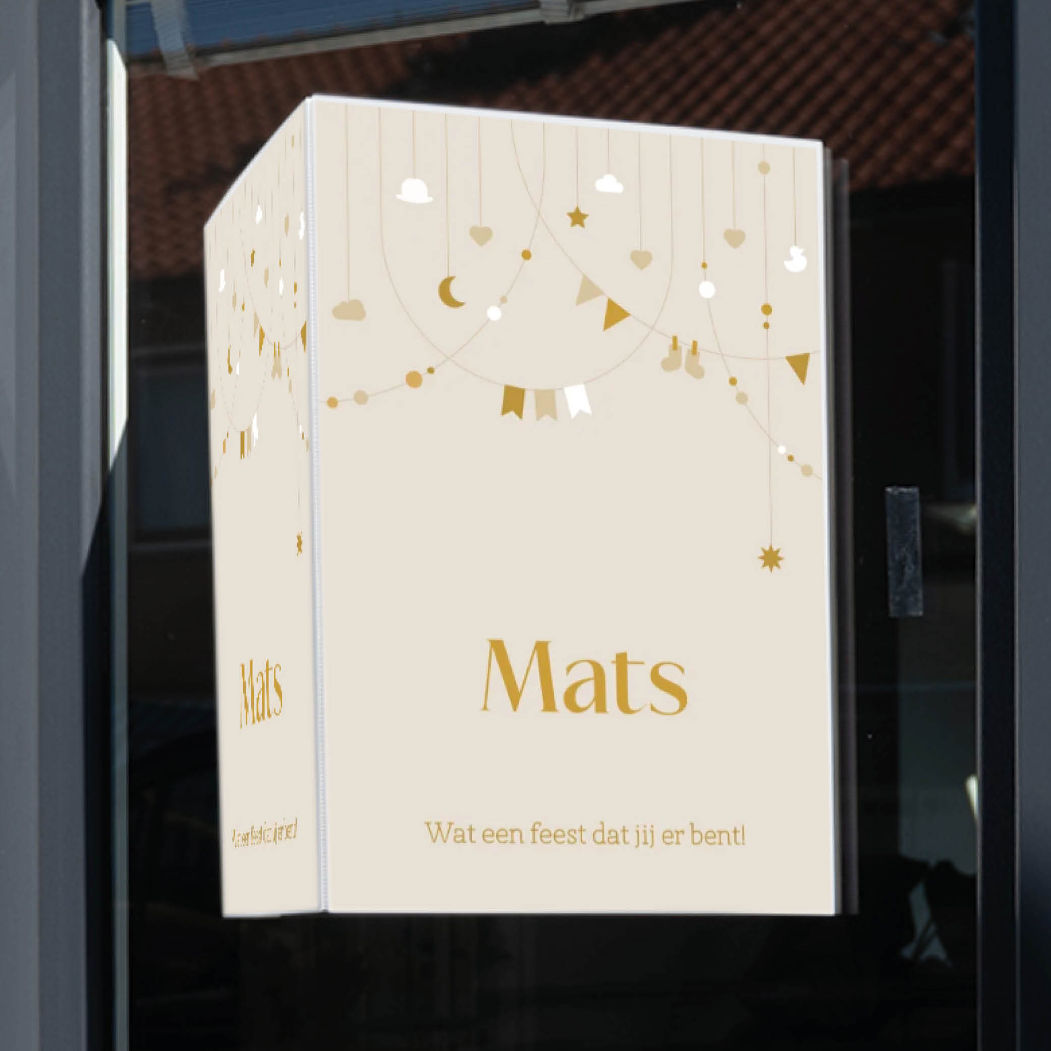 geboorte aankondigingsbord dubbel voor op het raam met slingers