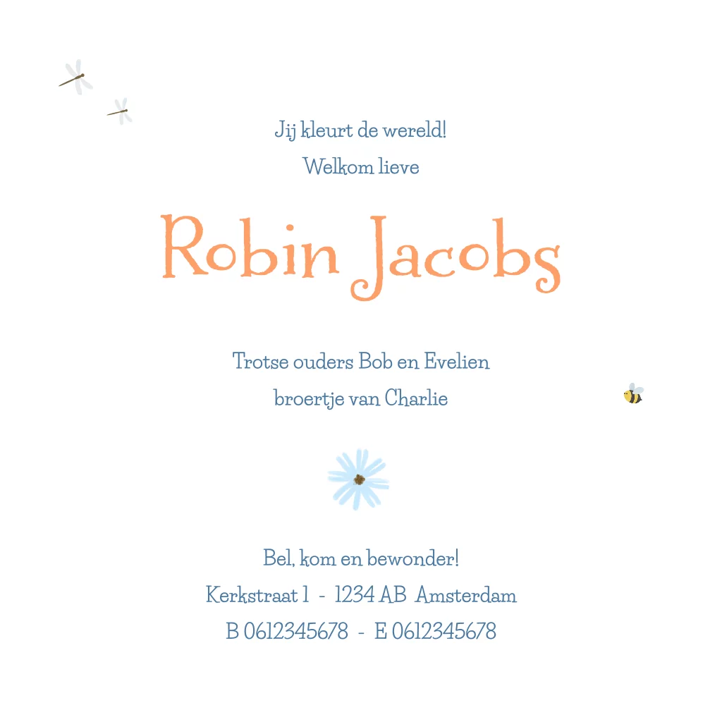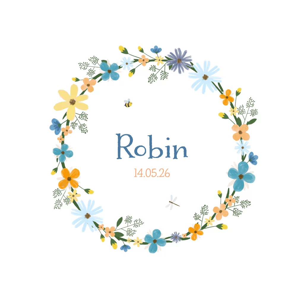 Geboortekaartje Robin met vrolijke voorjaars bloemenkrans in geel, oranje en blauwe tinten. Pas het ontwerp aan naar eigen wens. Hulp nodig bij het ontwerpen van je kaartje of wil je dit kaartje in een ander formaat? Stuur een berichtje, ik help je graag!