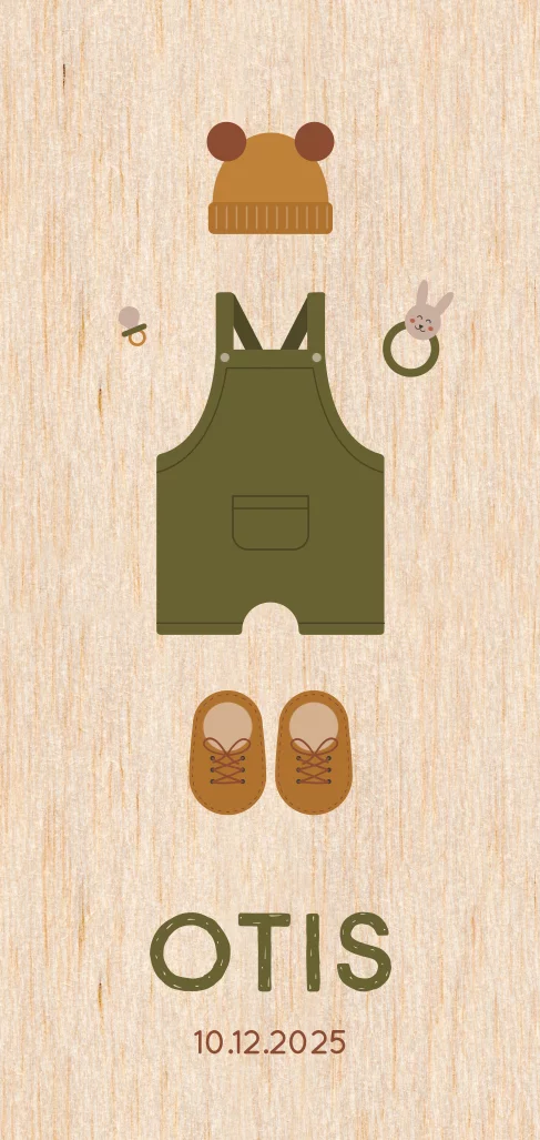 geboortekaartje jongen met winter kleertjes op echt hout
