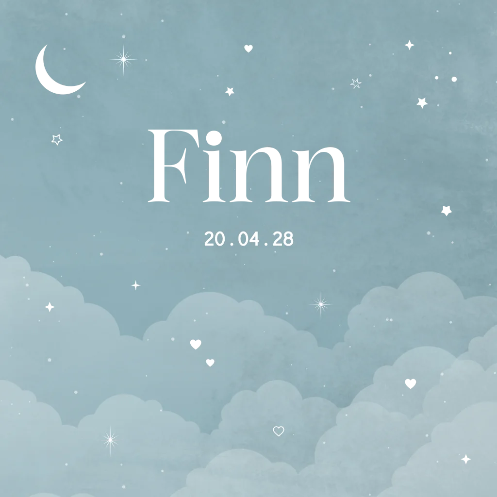 Dromerig geboortekaartje Finn met wolken en goudfolie elementen. Bewerk de kaart naar eigen wens. Hulp nodig bij het ontwerpen of wil je dit ontwerp in een ander formaat? Stuur een berichtje, we helpen je graag verder!