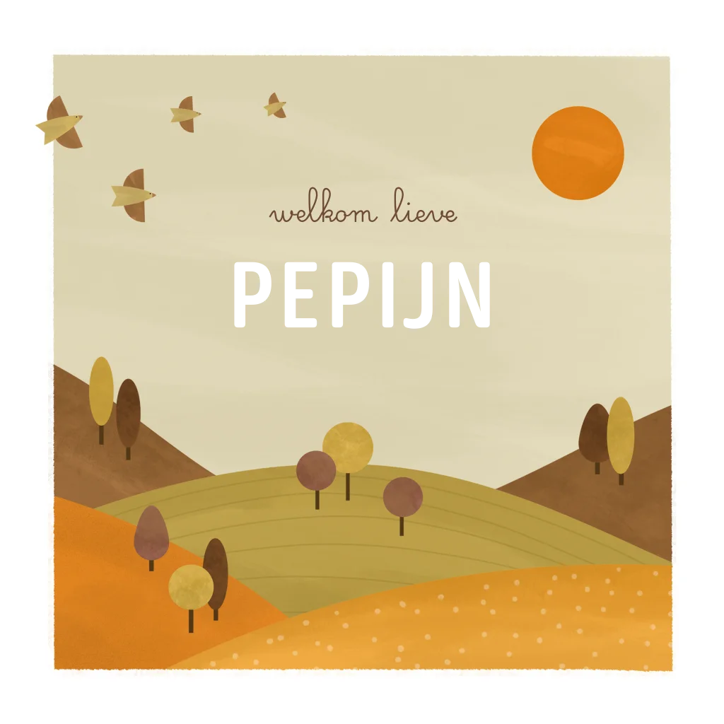 Een kleurrijk geboortekaartje met landschap en vogeltjes. Wil je dit kaartje liever in een ander formaat of heb je hulp nodig bij je ontwerp? Stuur een berichtje, we helpen je graag verder!