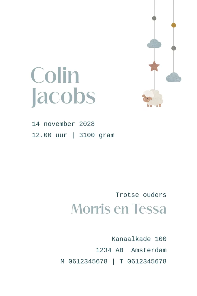 Een schattig geboortekaartje met schapen babymobiel. Bewerk de kaart naar eigen wens. Hulp nodig bij het ontwerpen van je kaart of wil je 'm in een ander formaat? Stuur een berichtje, we helpen je graag verder!