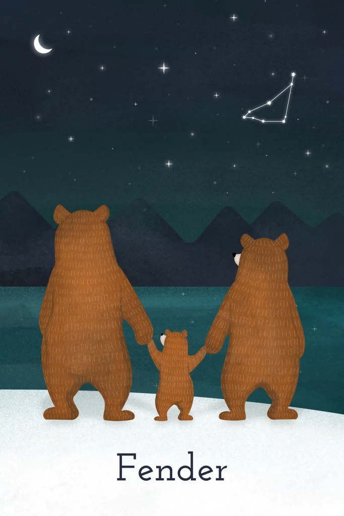 geboortekaartje Fender met beren kijkend naar sterren winter