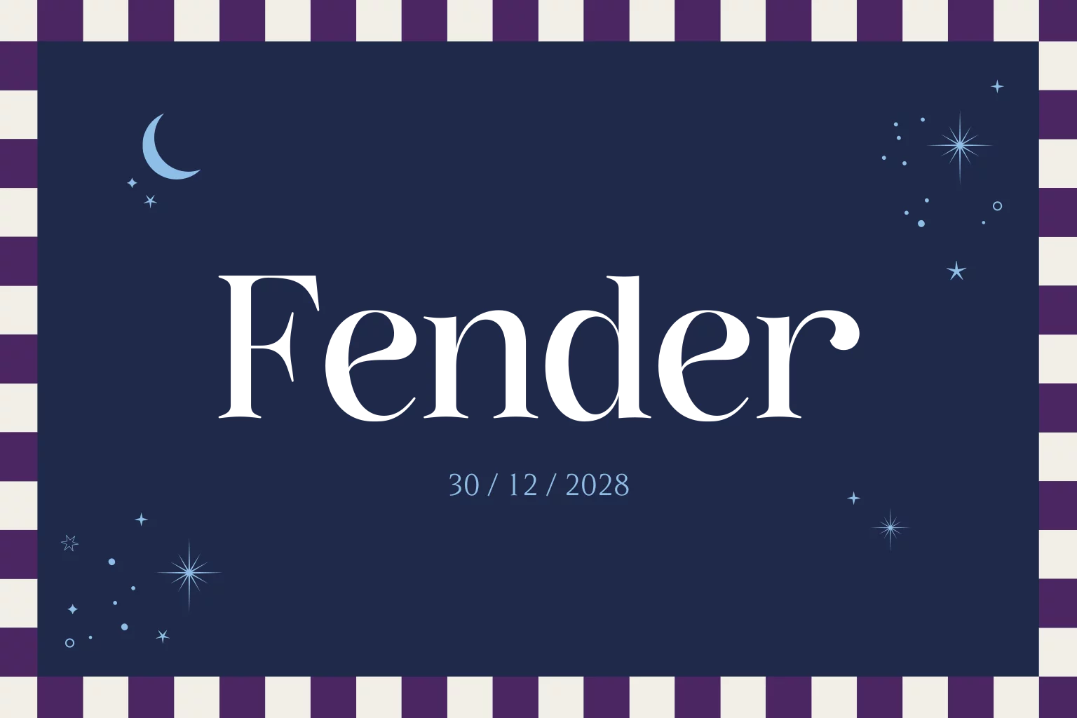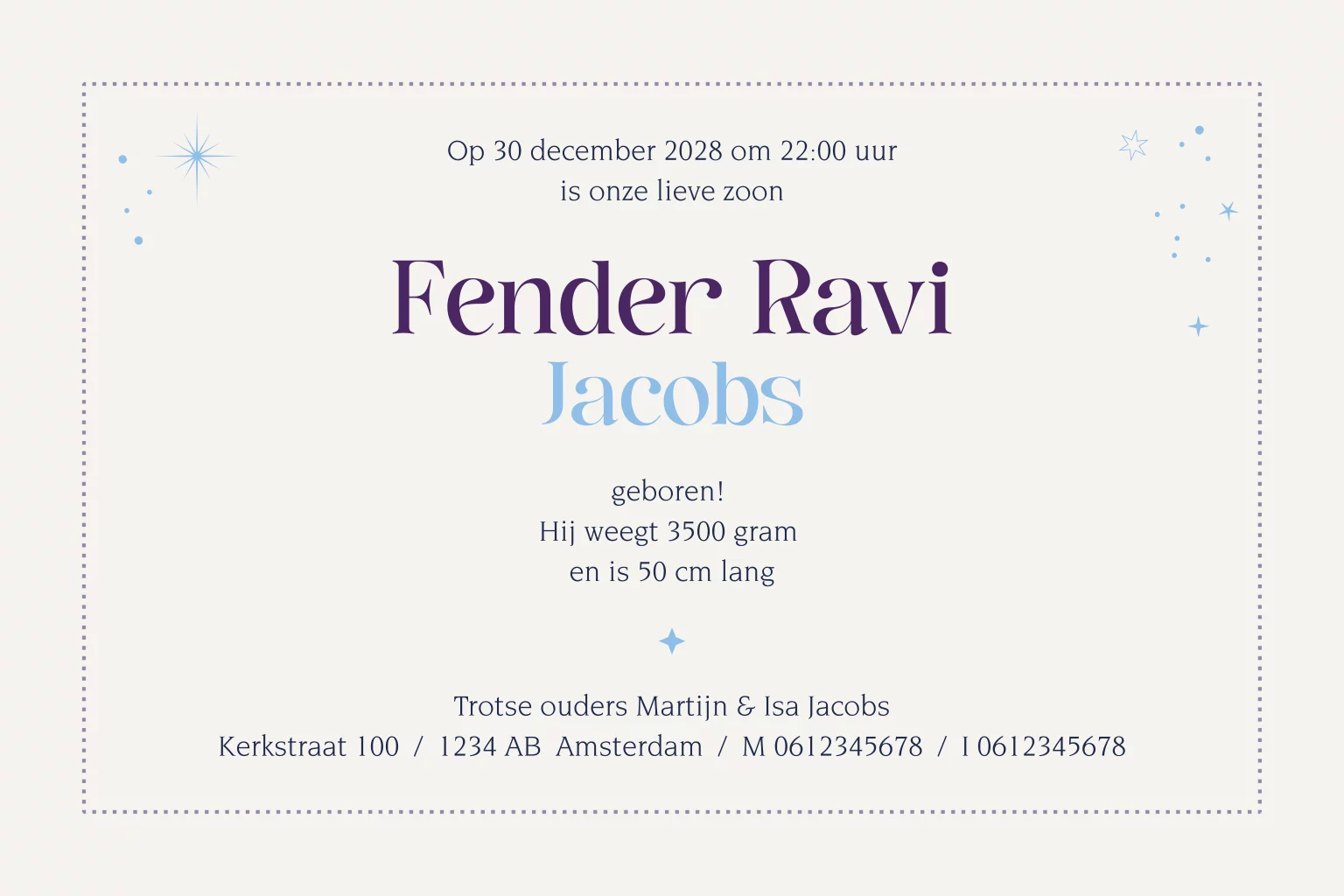 Geboortekaartje Fender met geblokte rand en sterren. Heb je hulp nodig bij het ontwerpen of wil je de kaart in een ander formaat? Stuur een berichtje, we helpen je graag verder!