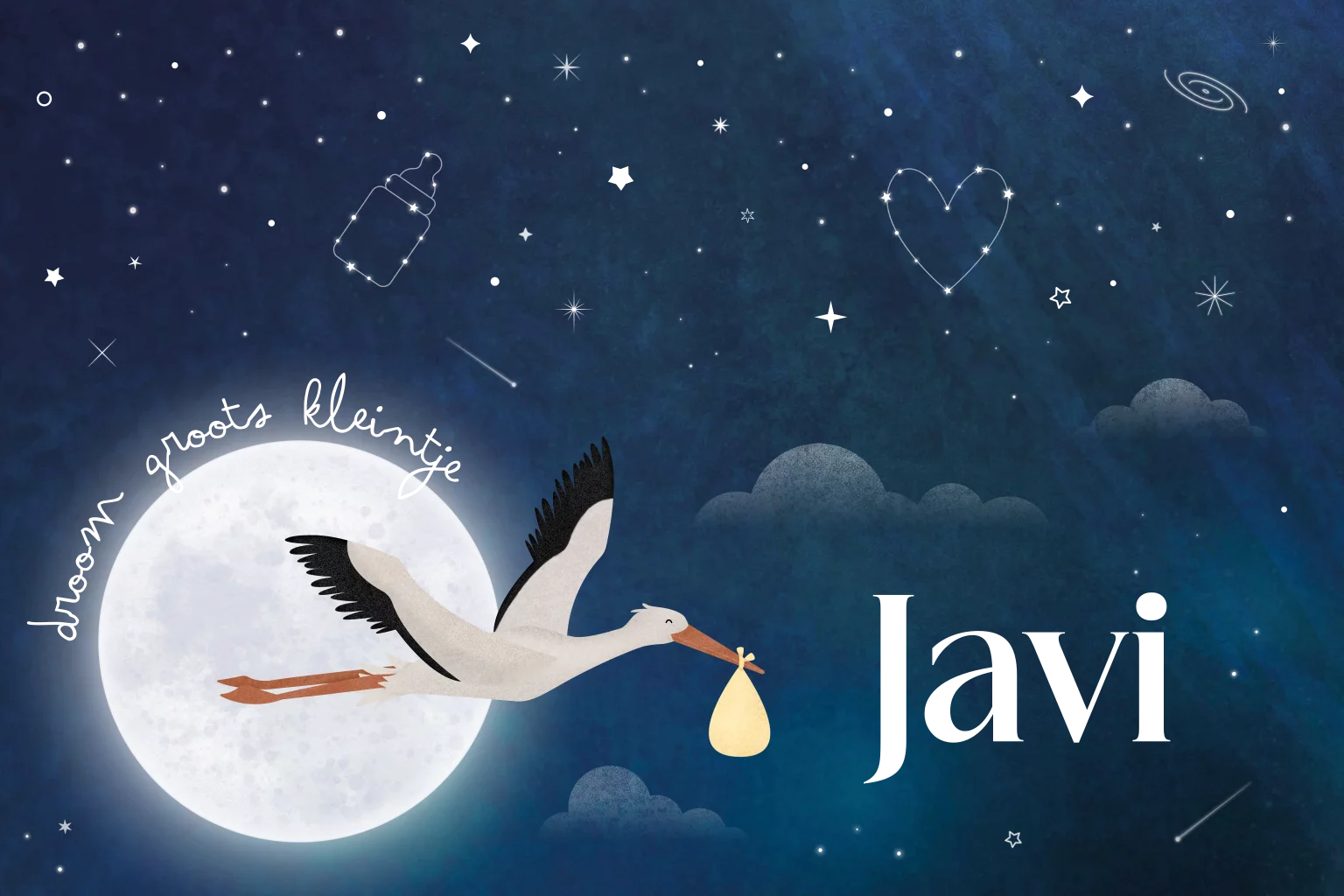 geboortekaartje Javi met maan, ooievaar en sterrenhemel