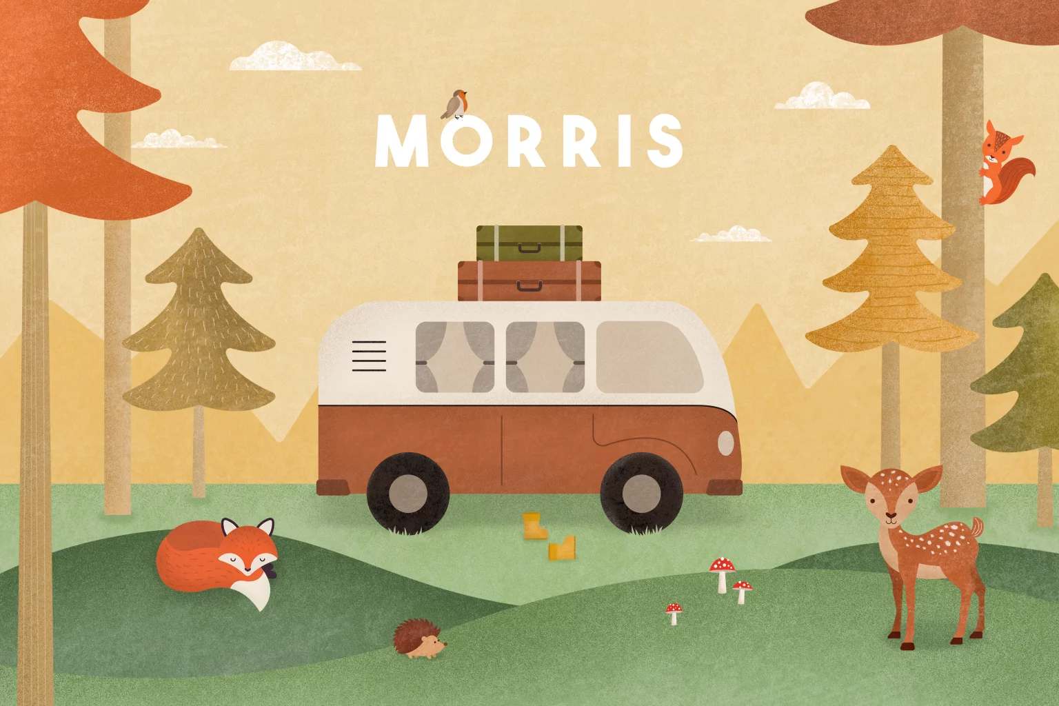 geboortekaartje Morris met camperbus en bosdiertjes
