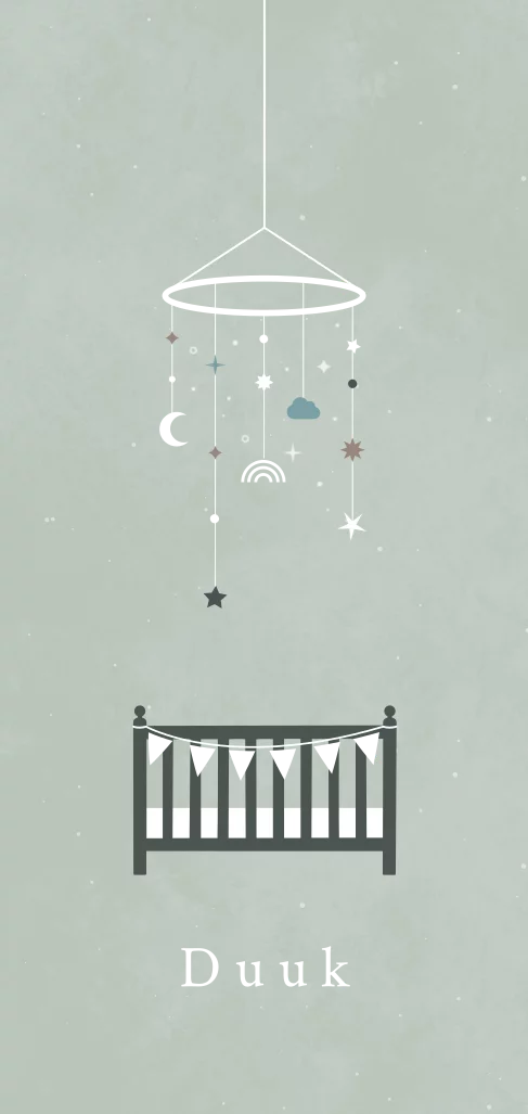 geboortekaartje Duuk met babymobiel en ledikantje
