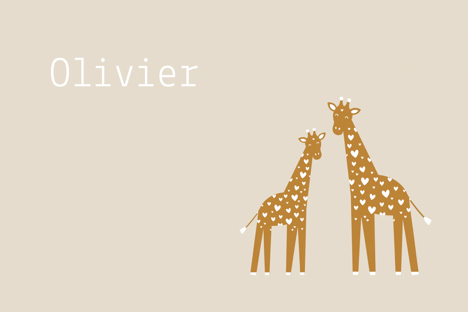 Een lief geboortekaartje met twee girafjes met hartjesprint in zwart(lak)folie. Extra leuk voor een tweede kindje! Je kunt de achtergrond, het lettertype en de foliekleur naar wens aanpassen. Heb je hulp nodig bij het ontwerpen of wil je dit ontwerp in een ander formaat kaart? Stuur mij een berichtje, dan zet ik dit kosteloos voor je om!