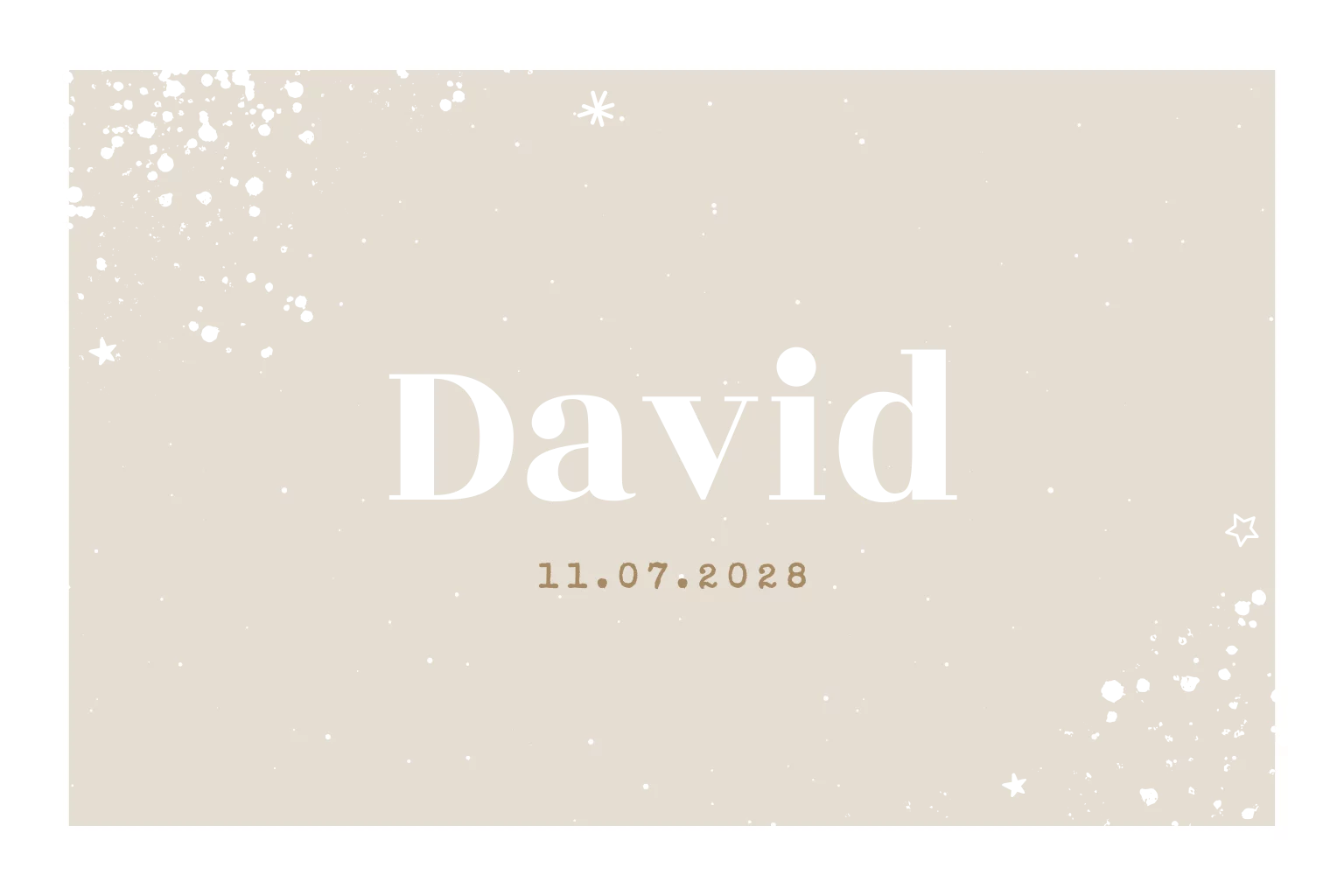 Een minimalistisch geboortekaartje voor een jongen met spetters in goudfolie. Achtergrond en foliekleur zijn naar wens aan te passen. Heb je hulp nodig bij het ontwerpen van je kaartje? Stuur mij gerust een berichtje! Ik help je graag.