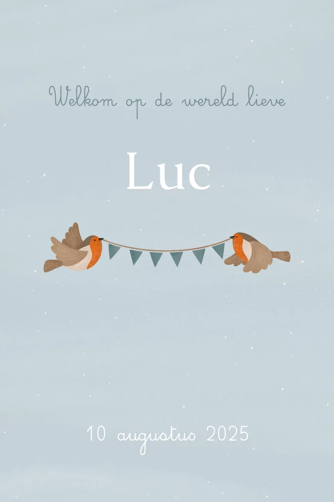 Een schattig geboortekaartje voor een jongen met roodborstjes. De achtergrond, het lettertype en de kleuren zijn naar wens aan te passen. Hulp nodig bij het ontwerpen van je kaartje? Stuur mij een berichtje, ik help je graag!