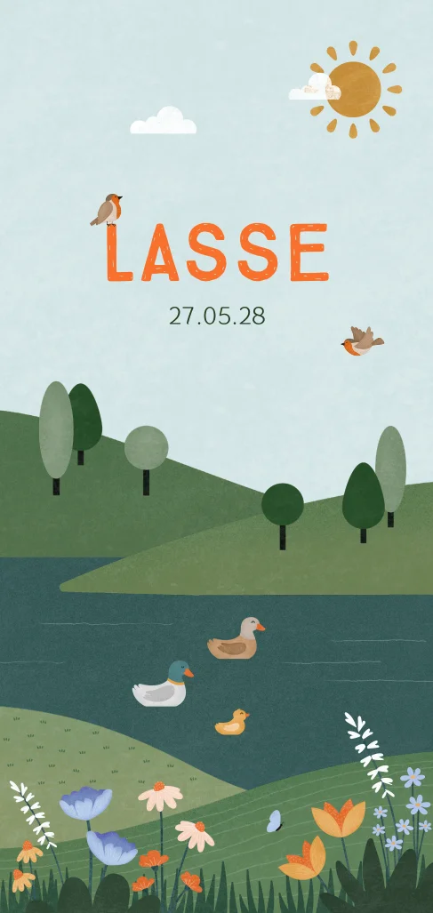 geboortekaartje Lasse met een eenden familie in de natuur