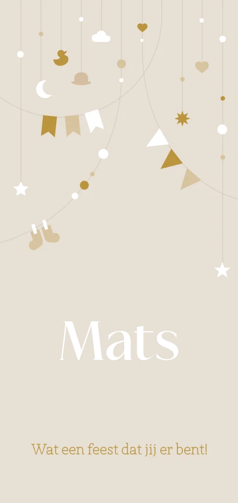 Geboortekaartje Mats met slingers en elementen in goudfolie. De kleuren van de elementen zijn naar eigen wens aan te passen. Hulp nodig bij je ontwerp of wil je de kaart in een ander formaat? Stuur een berichtje, we helpen je graag verder!