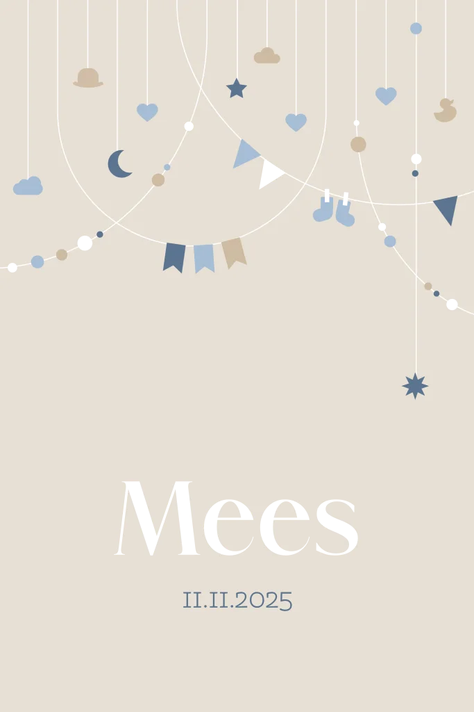Geboortekaartje Mees met slingers en elementen in goudfolie. De kleuren van de elementen zijn naar eigen wens aan te passen. Hulp nodig bij je ontwerp of wil je de kaart in een ander formaat? Stuur een berichtje, we helpen je graag verder!