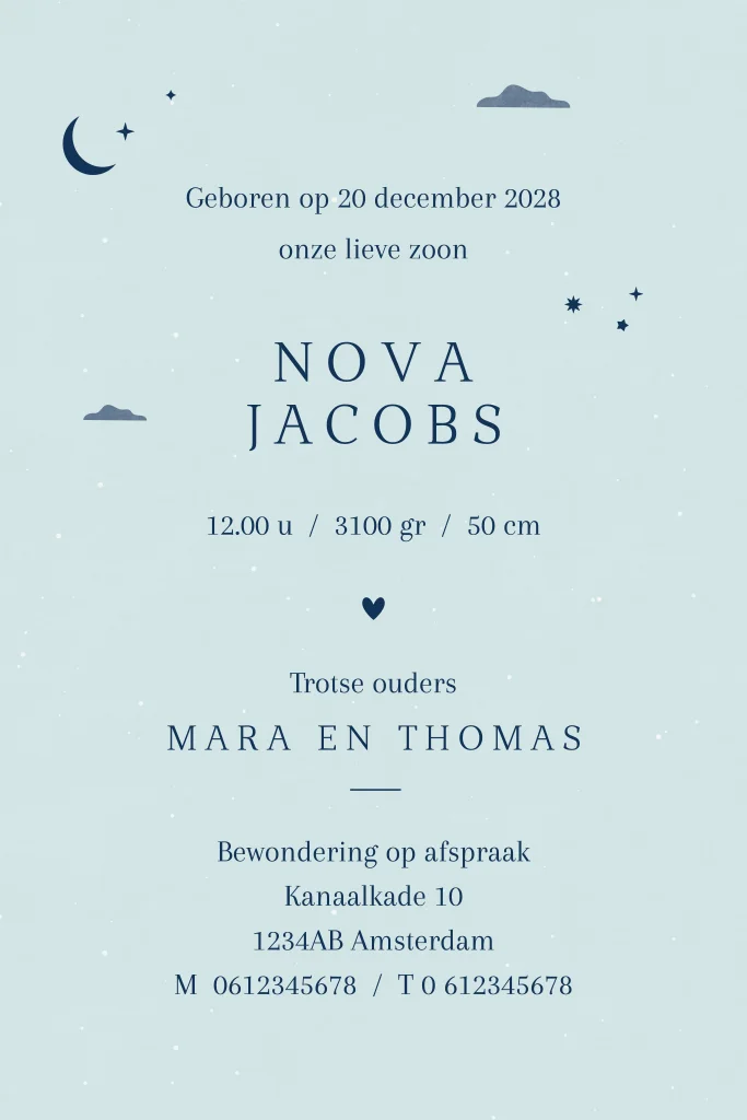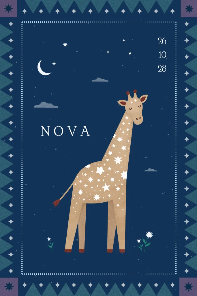 Dromerig geboortekaartje Nova met giraf met sterrenprint. Bewerk de kaart naar eigen wens. Hulp nodig bij het ontwerpen of wil je dit ontwerp in een ander formaat? Stuur een berichtje, we helpen je graag verder!