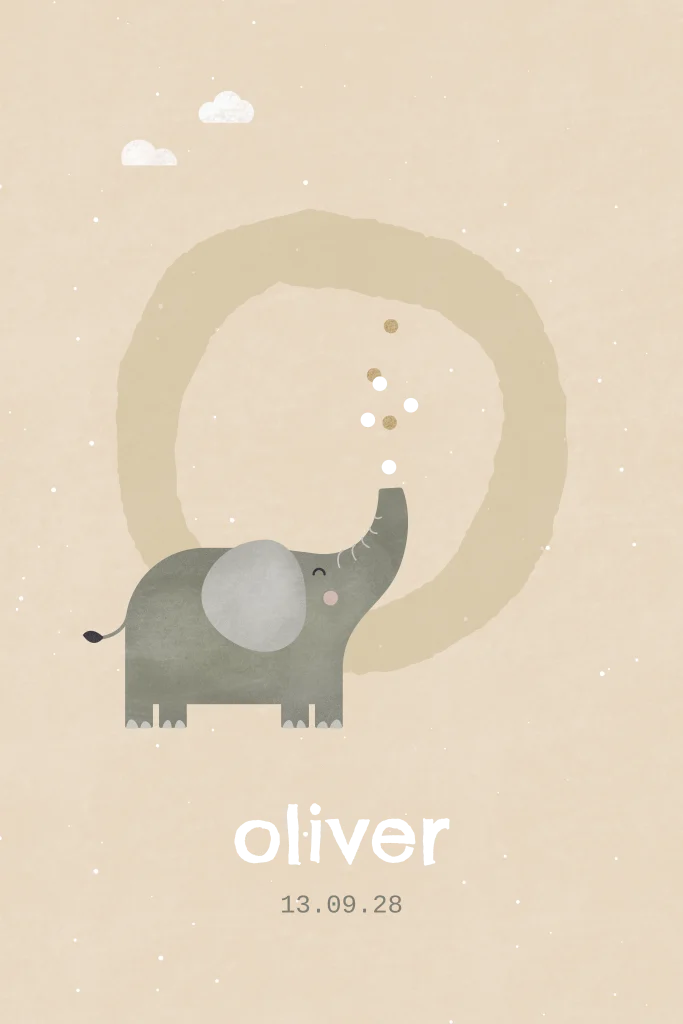Een feestelijk geboortekaartje met groot initiaal, en een olifantje met confetti. Bewerk de kaart naar eigen wens. Hulp nodig bij het ontwerpen of wil je dit ontwerp in een ander formaat? Stuur een berichtje, we helpen je graag verder!