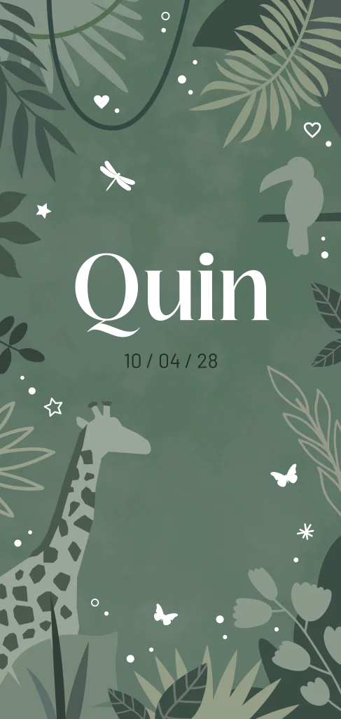 Een jungle geboortekaartje in groene tinten. Heb je hulp nodig bij het ontwerpen van je kaart of wil je 'm in een ander formaat? Stuur een berichtje, we helpen je graag verder!