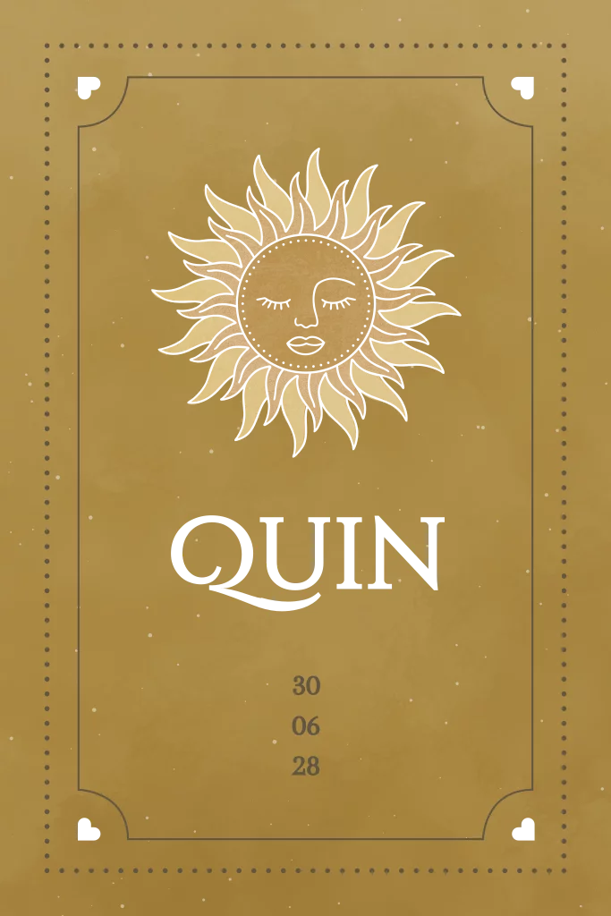 Geboortekaartje Quin met zon in goudfolie en speelse kaders. Bewerk de kaart naar eigen wens. Hulp nodig bij het ontwerpen of wil je een ander formaat kaart? Stuur een berichtje, we helpen je graag verder!