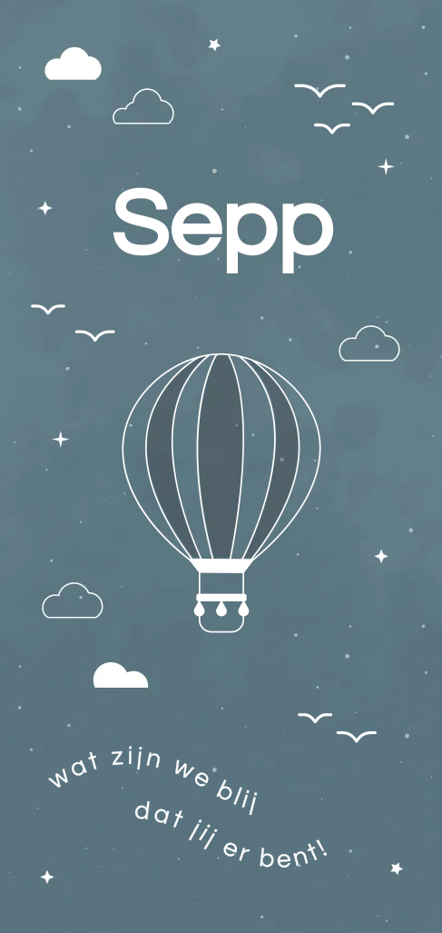 Geboortekaartje Sepp met luchtballon in goudfolie. Bewerk de kaart naar eigen wens. Hulp nodig bij het ontwerpen of wil je dit ontwerp in een ander formaat? Stuur een berichtje, we helpen je graag verder!