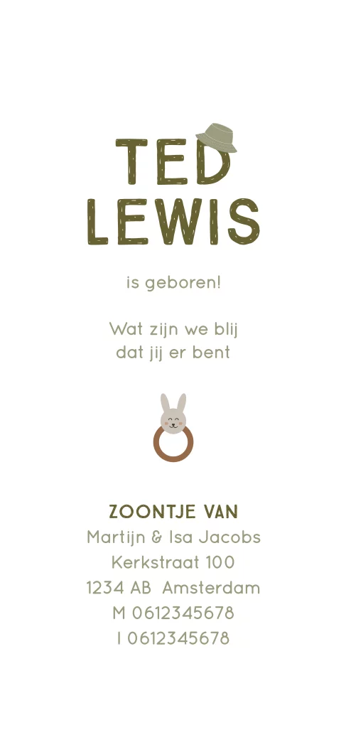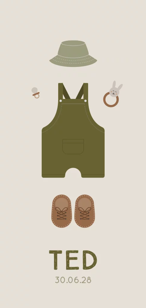 Een schattig geboortekaartje voor een jongen met babykleertjes. Wil je dit design in een ander formaat of heb je hulp nodig bij het ontwerpen? Stuur dan een berichtje, we helpen je graag verder!