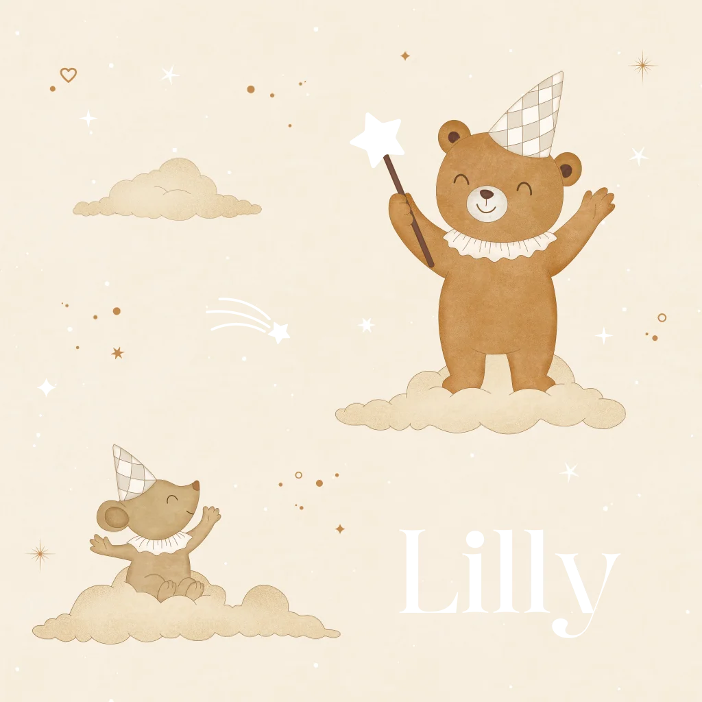 dromerig geboortekaartje Lilly met beer en muis op wolken