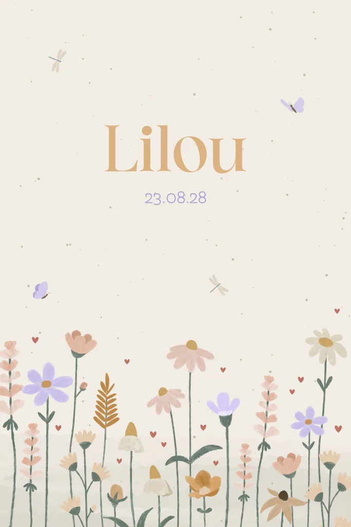 Geboortekaartje met geïllustreerde bloemen en hartjes. Pas het ontwerp aan naar eigen wens en bestel je eerste proefdruk vanaf €1! Wil je dit ontwerp graag in een ander formaat of heb je hulp nodig bij je ontwerp? Stuur een berichtje, we helpen je graag verder!