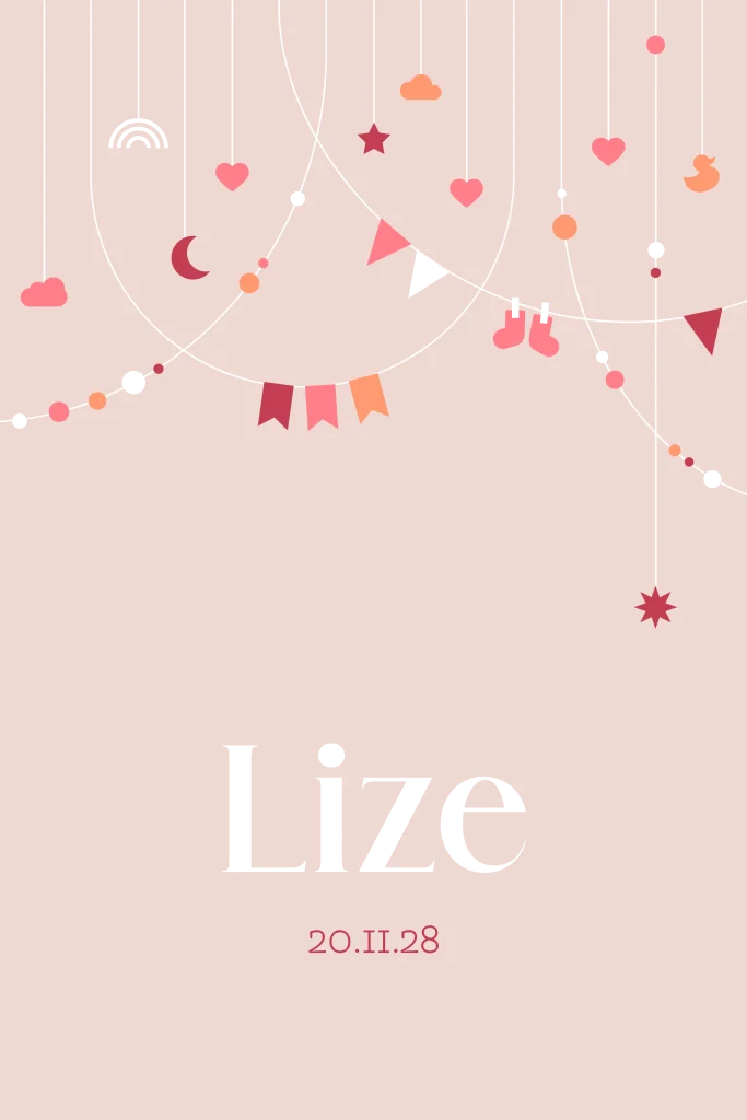 Geboortekaartje Lize met slingers en elementen in goudfolie. De kleuren van de elementen zijn naar eigen wens aan te passen. Hulp nodig bij het ontwerpen van je kaart of wil je dat ik even meekijk? Stuur een berichtje, we helpen je graag verder!