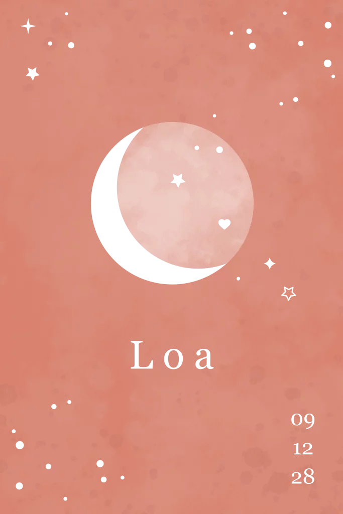 Geboortekaartje Loa met maan en sterren in goudfolie. De achtergrond, het lettertype en de foliekleur zijn naar eens aan te passen. Heb je hulp nodig bij het ontwerpen? Stuur een berichtje, we helpen je graag verder!