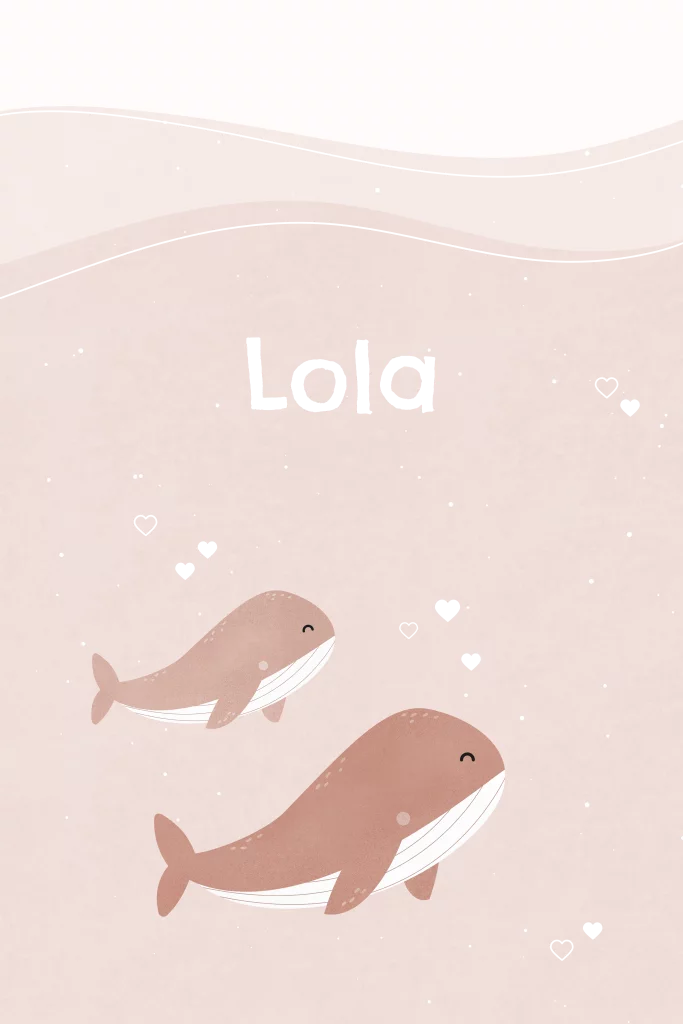 Een schattig geboortekaartje met een kleine en een grotere walvis. Heb je hulp nodig bij het ontwerpen van je kaart of wil je 'm in een ander formaat? Stuur een berichtje, we helpen je graag!