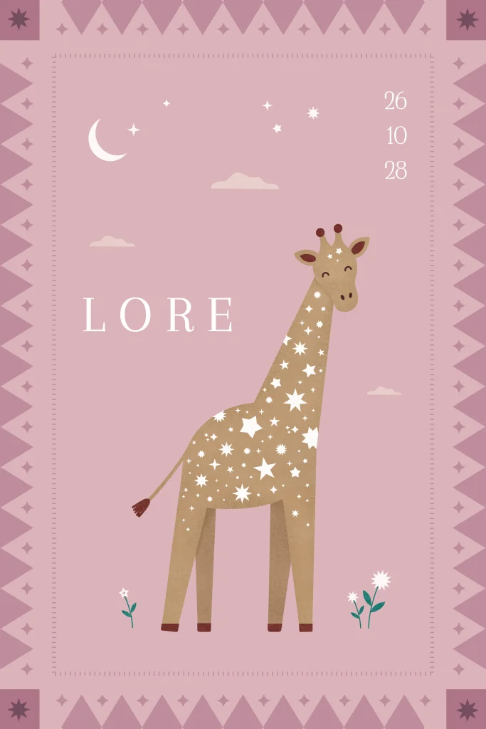 Dromerig geboortekaartje Lore met giraf met sterrenprint. Bewerk de kaart naar eigen wens. Hulp nodig bij het ontwerpen of wil je dit ontwerp in een ander formaat? Stuur een berichtje, we helpen je graag verder!