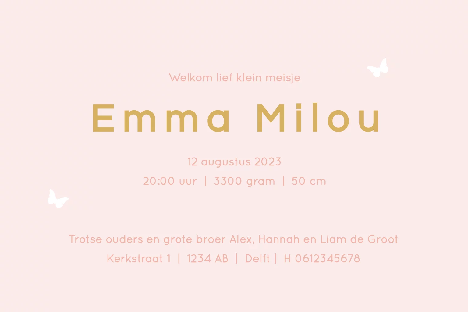 Een schattig geboortekaartje met bloemen en vlindertjes. Naam en stipjes in goudfolie. Foliekleur is naar wens aan te passen!