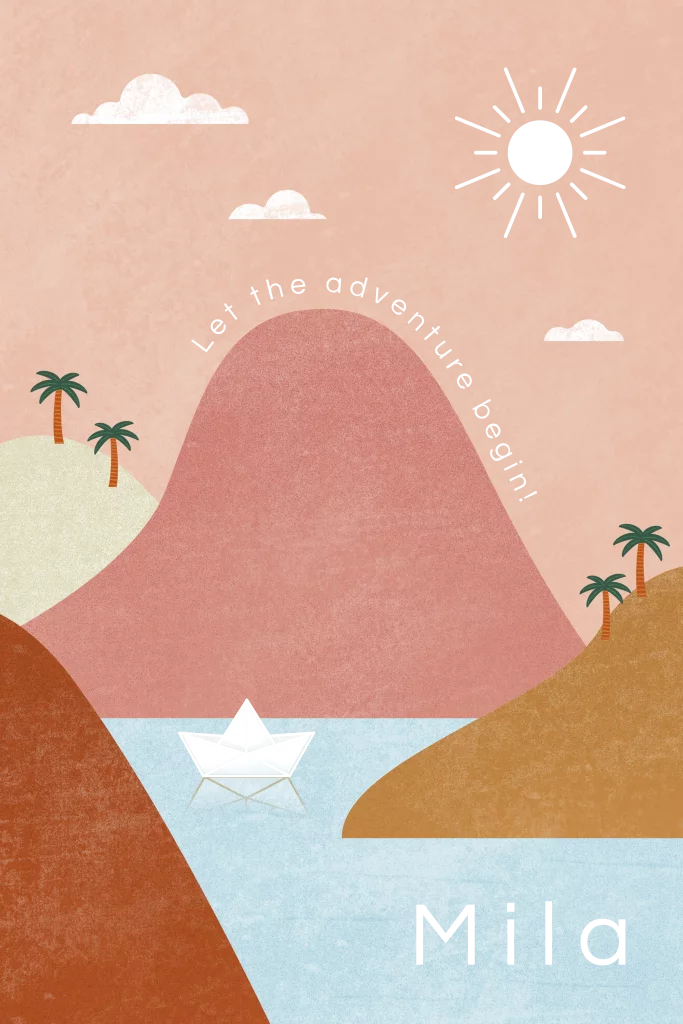 Een avontuurlijk geboortekaartje voor een meisje met bergen een een bootje in goudfolie. Foliekleur is naar wens aan te passen. Hulp nodig bij het ontwerpen van je kaartje? Stuur mij een berichtje, ik help je graag!