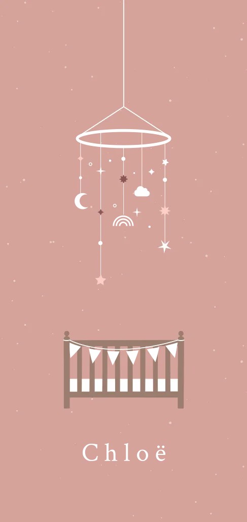 Een schattig geboortekaartje met babymobiel en ledikantje met verschillende elementjes in roségoudfolie. De foliekleur en de achtergrond is naar wens aan te passen. Wil je dit kaartje in een ander formaat of heb je hulp nodig bij je ontwerp? Stuur mij een berichtje, ik help je graag!