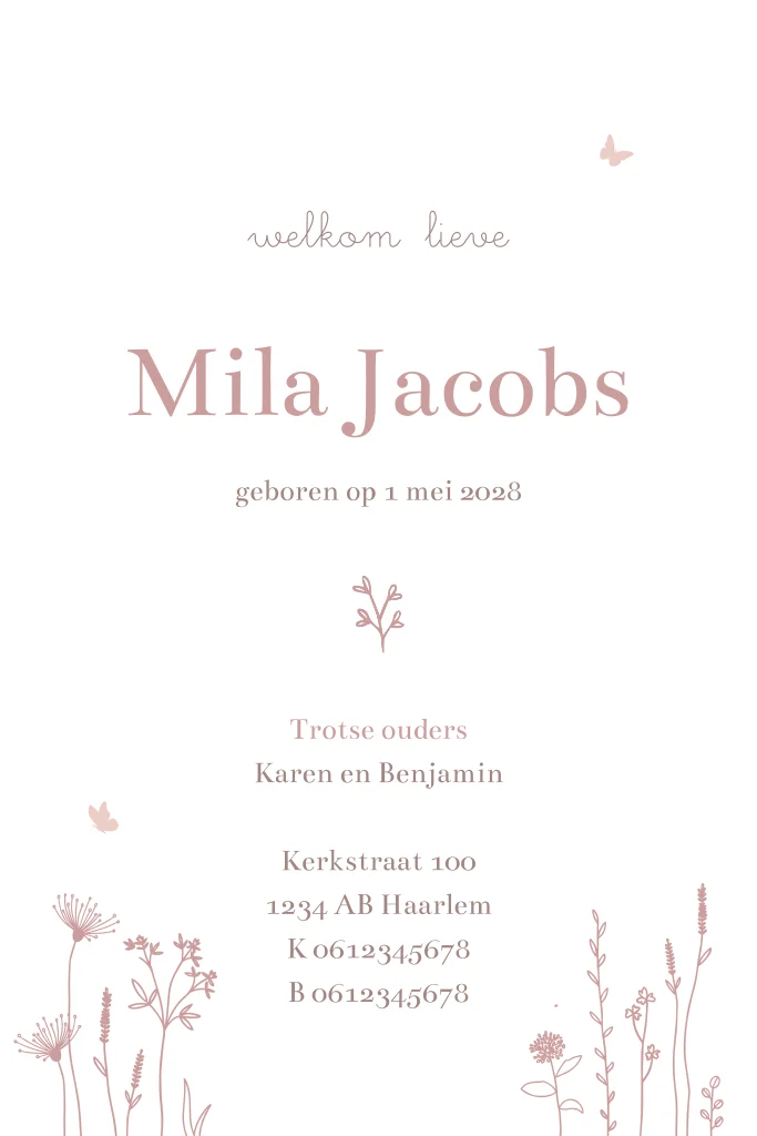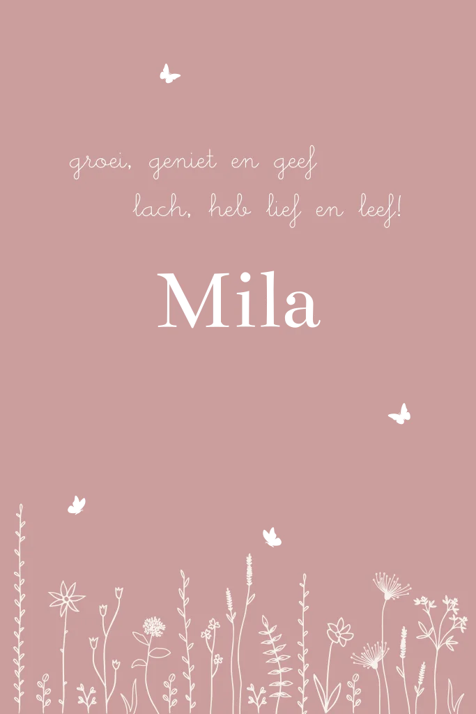 geboortekaartje Mila met veldbloemen en roségoudfolie