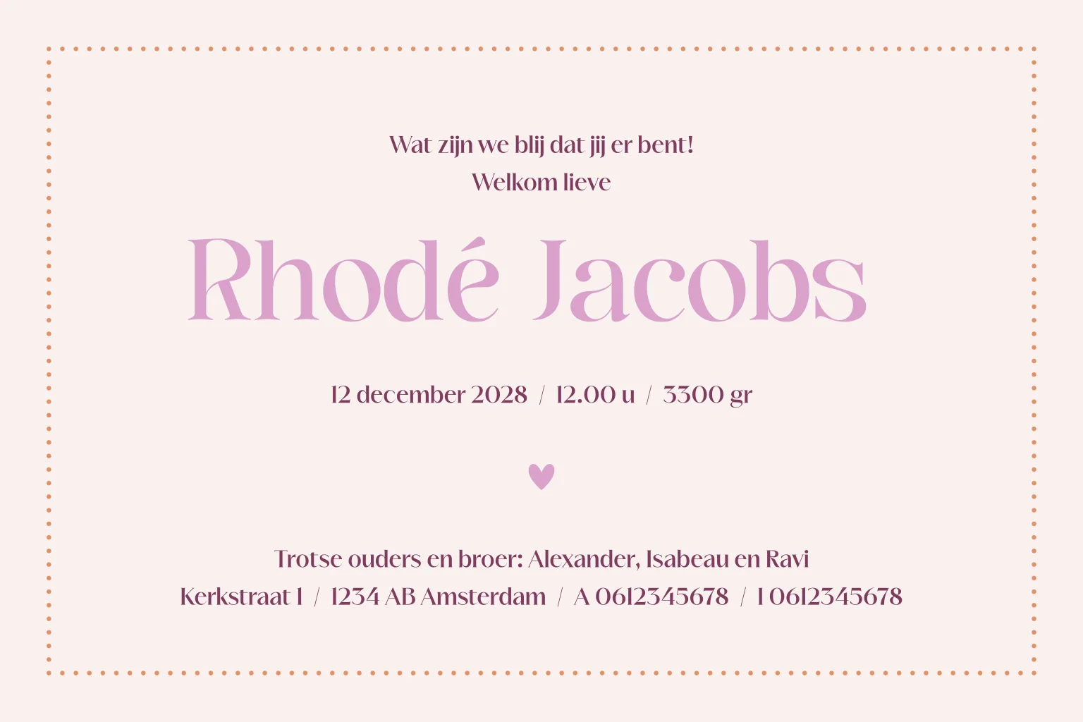 Geboortekaartje Rhodé met speelde rand en naam in foliedruk. Heb je hulp nodig bij het ontwerpen of wil je de kaart in een ander formaat? Stuur een berichtje, we helpen je graag verder!