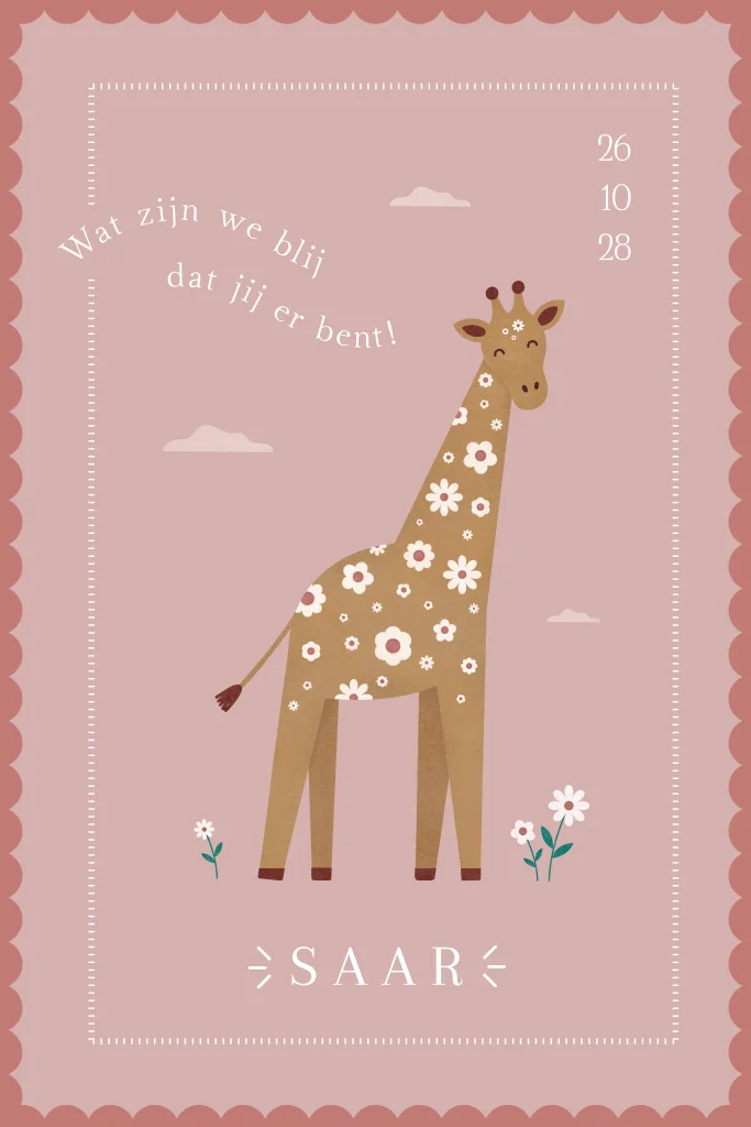 Schattig geboortekaartje Saar met giraf met bloemenprint. Bewerk de kaart naar eigen wens. Hulp nodig bij het ontwerpen of wil je dit ontwerp in een ander formaat? Stuur een berichtje, we helpen je graag verder!