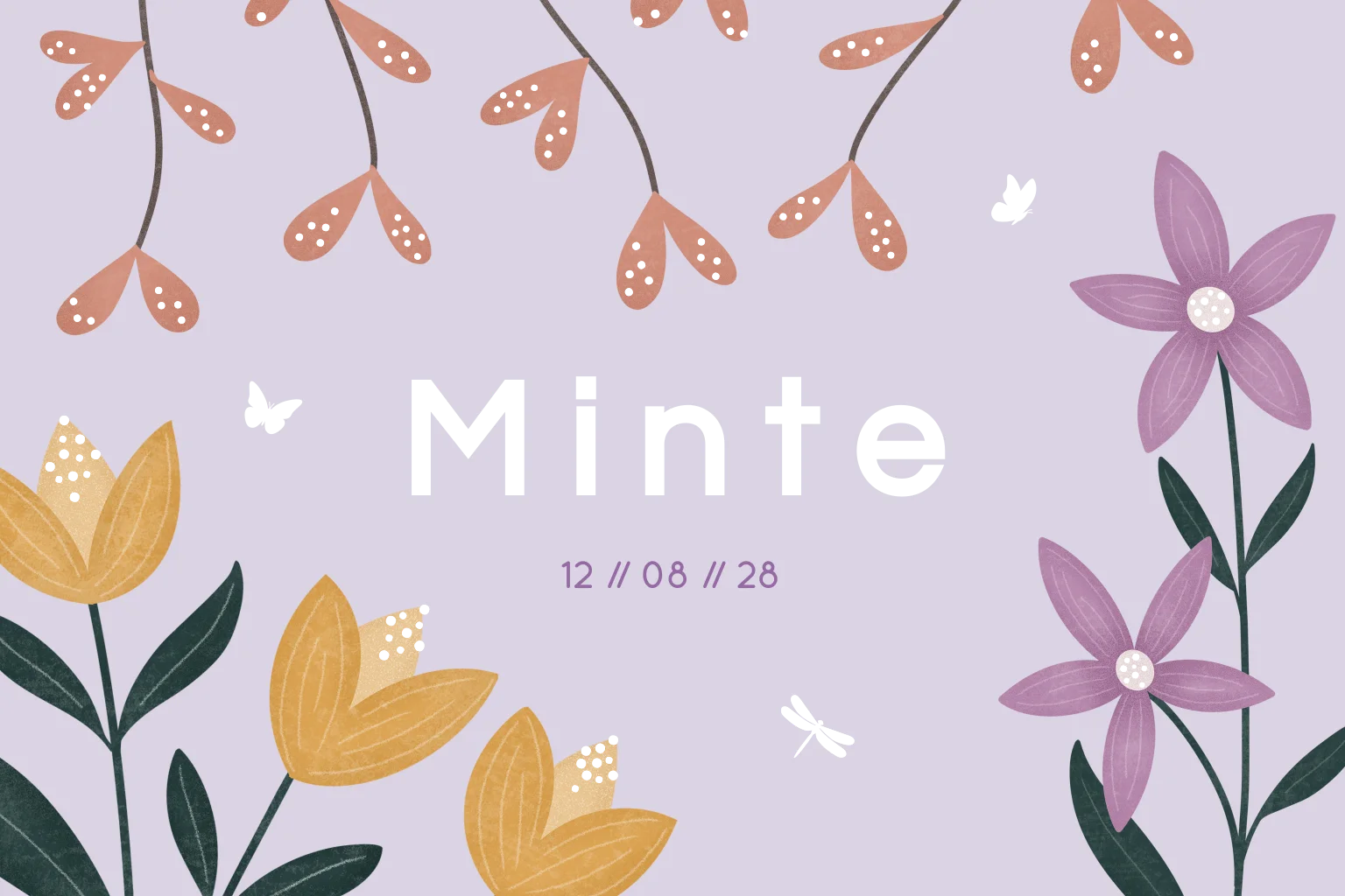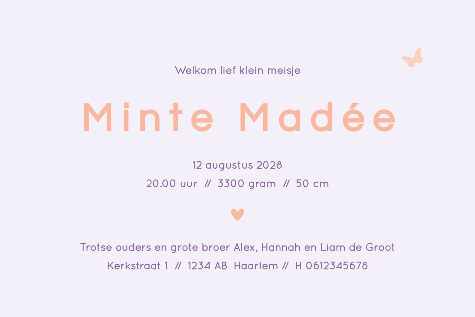 Een kleurrijk, fleurig geboortekaartje voor een meisje met geïllustreerde bloemen en vlindertjes. Naam en stipjes in foliedruk. Bewerk de kaart naar eigen wens. Hulp nodig bij het ontwerpen van je kaart? Stuur een berichtje, we helpen je graag verder!