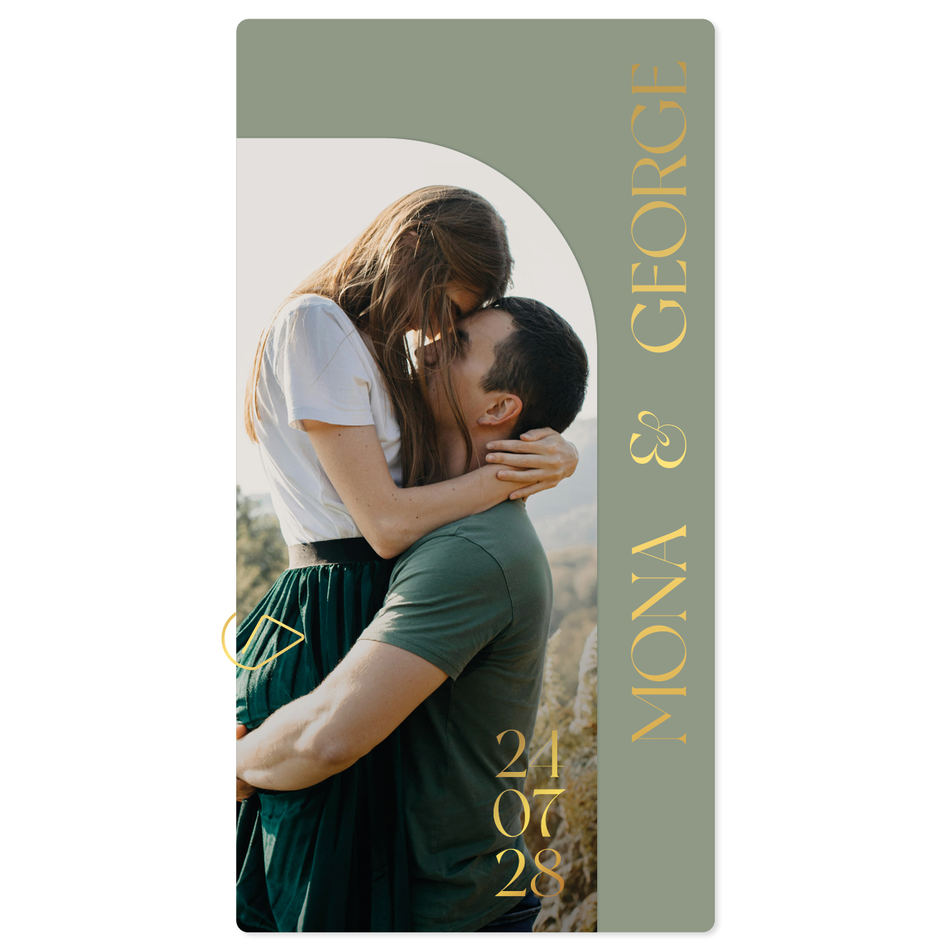 Moderne stapel trouwkaart met foto en goudfolie. De grootste kaart heeft formaat 10x21 cm en past in een envelop met formaat 11x22 cm. Je kunt de achtergrond, het lettertype en kleuren naar eigen wens aanpassen. Bevestig de kaarten aan elkaar met een leuke paperclip. Hulp nodig bij het ontwerpen van je kaart? Stuur een berichtje, we helpen je graag verder!