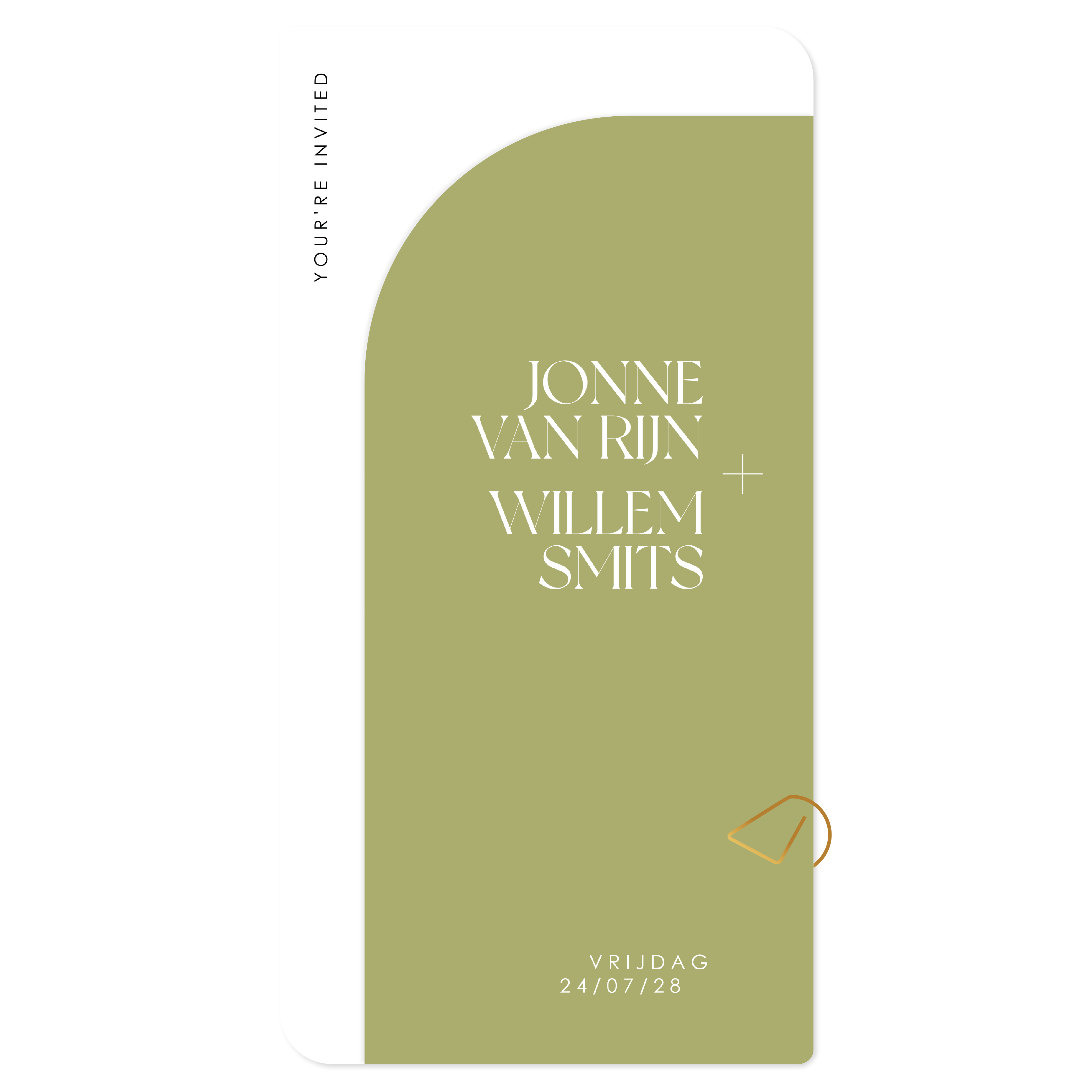 Stapel trouwkaart. Grootste kaart heeft formaat 10x21 cm en past in een envelop met formaat 11x22 cm. Je kunt de achtergrond, het lettertype en kleuren naar eigen wens aanpassen. Bevestig de kaarten aan elkaar met een leuke paperclip. Hulp nodig bij het ontwerpen van je kaart? Stuur een berichtje, we helpen je graag verder!