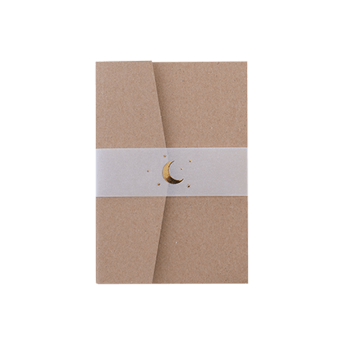 Bellyband van kalkpapier met goudfolie maan en sterren. Gaaf om een pocketfold of om een set kaarten. Gemakkelijk vast te maken met een mooie sluitzegel.