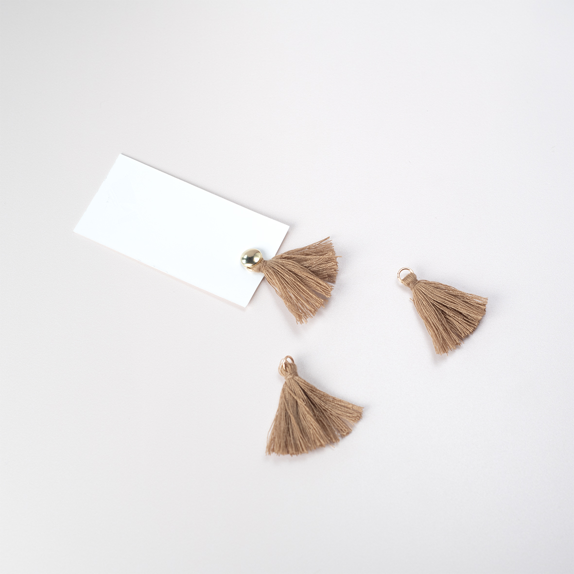 Bruine tassels (25 stuks) met een klein gouden ringetje. Bevestig deze met een splitpen of koordje aan de kaart.