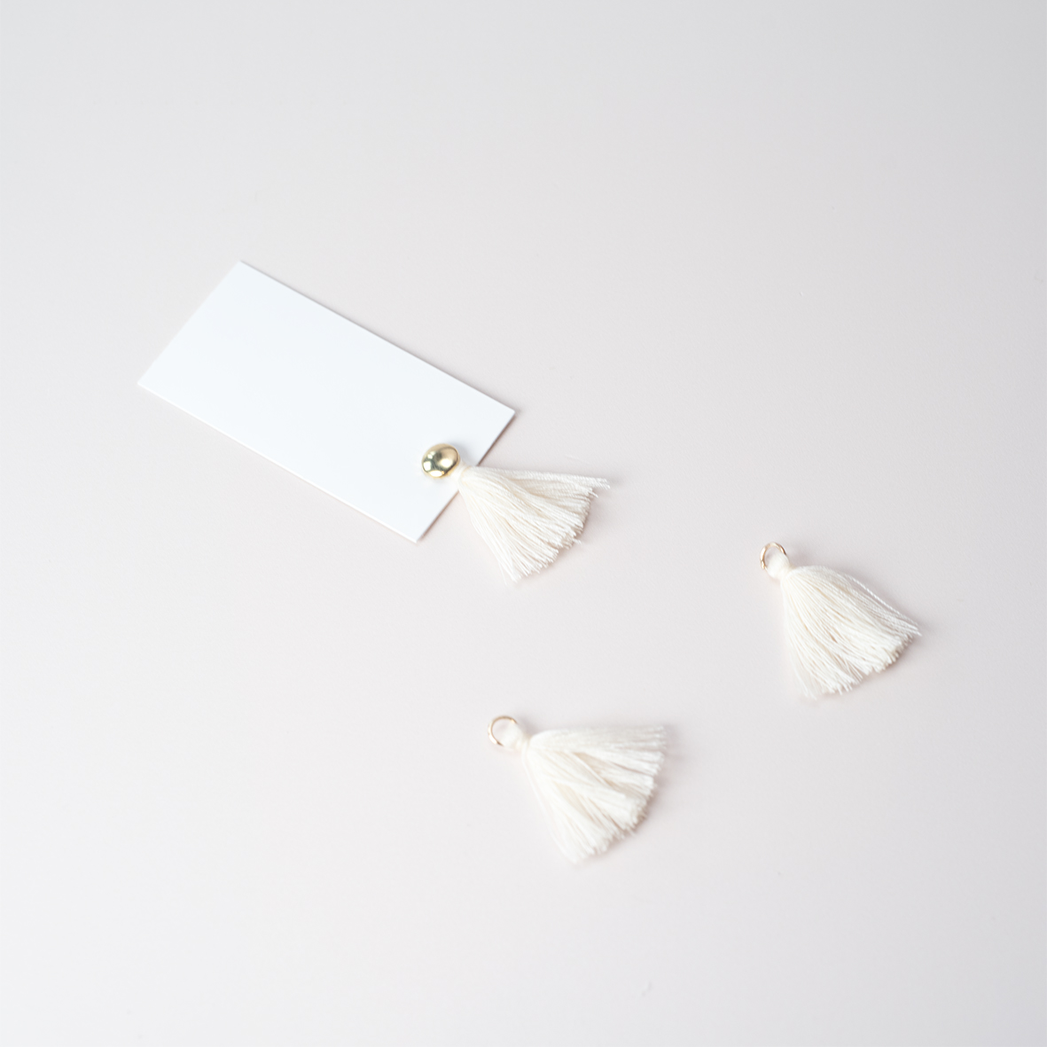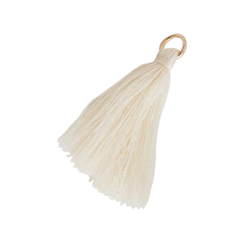 Crèmekleurige tassels (25 stuks) met een klein gouden ringetje. Bevestig deze met een splitpen of koordje aan de kaart.