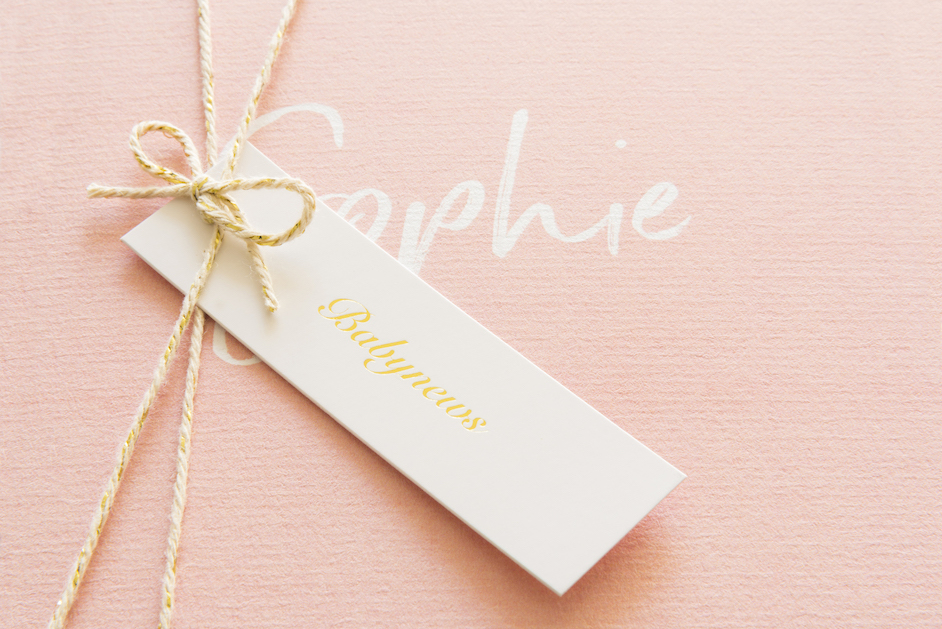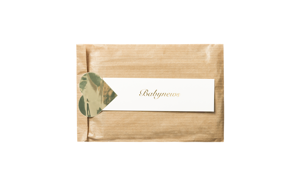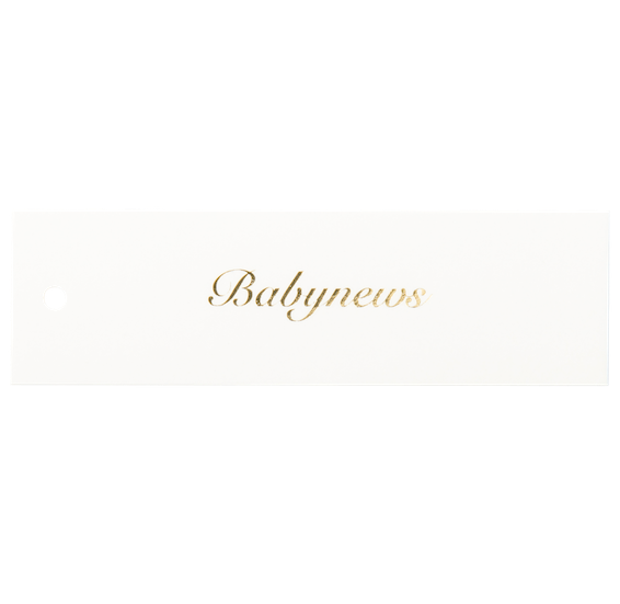 Hip wit labeltje met de tekst Babynews in echt goudkleurige letters