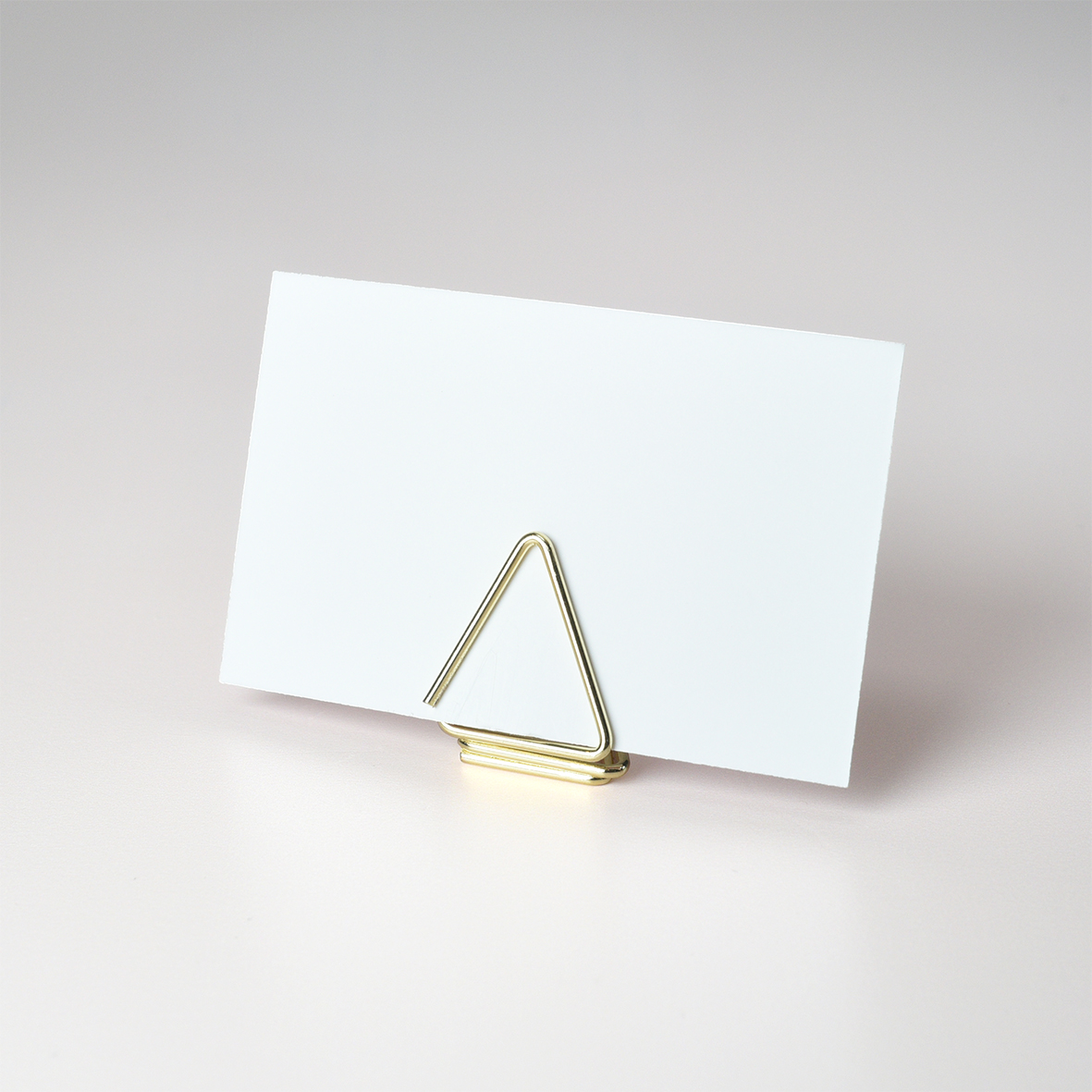 Driehoekvormige, gouden naamkaarthouders (10 stuks). Formaat: 2 cm (breedte) x 2 cm (hoogte).