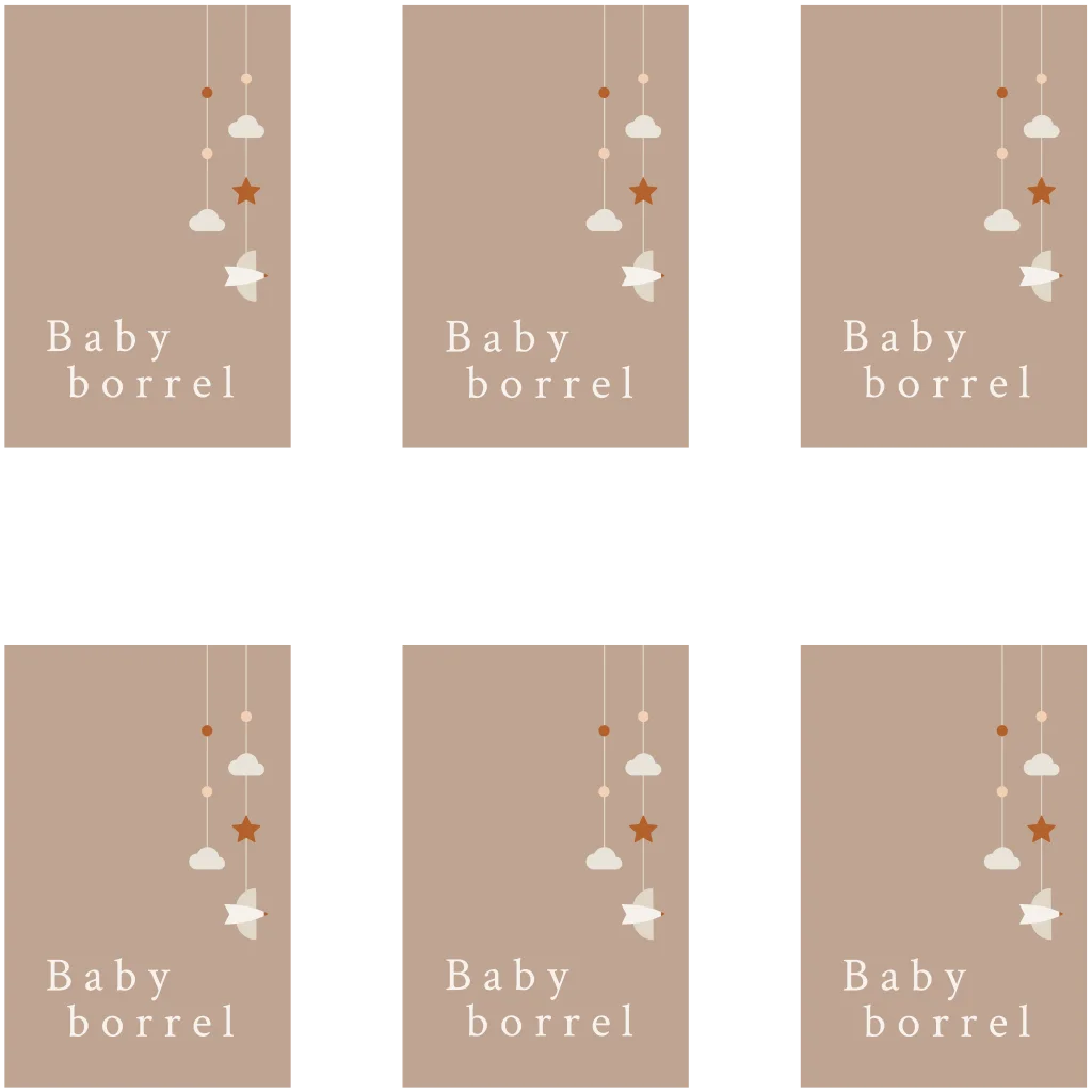 Bewerk deze kraamborrelkaartjes naar eigen wens. Te bestellen per 6 stuks. Het formaat van de kaartjes is 5,5 x 8,5 cm.