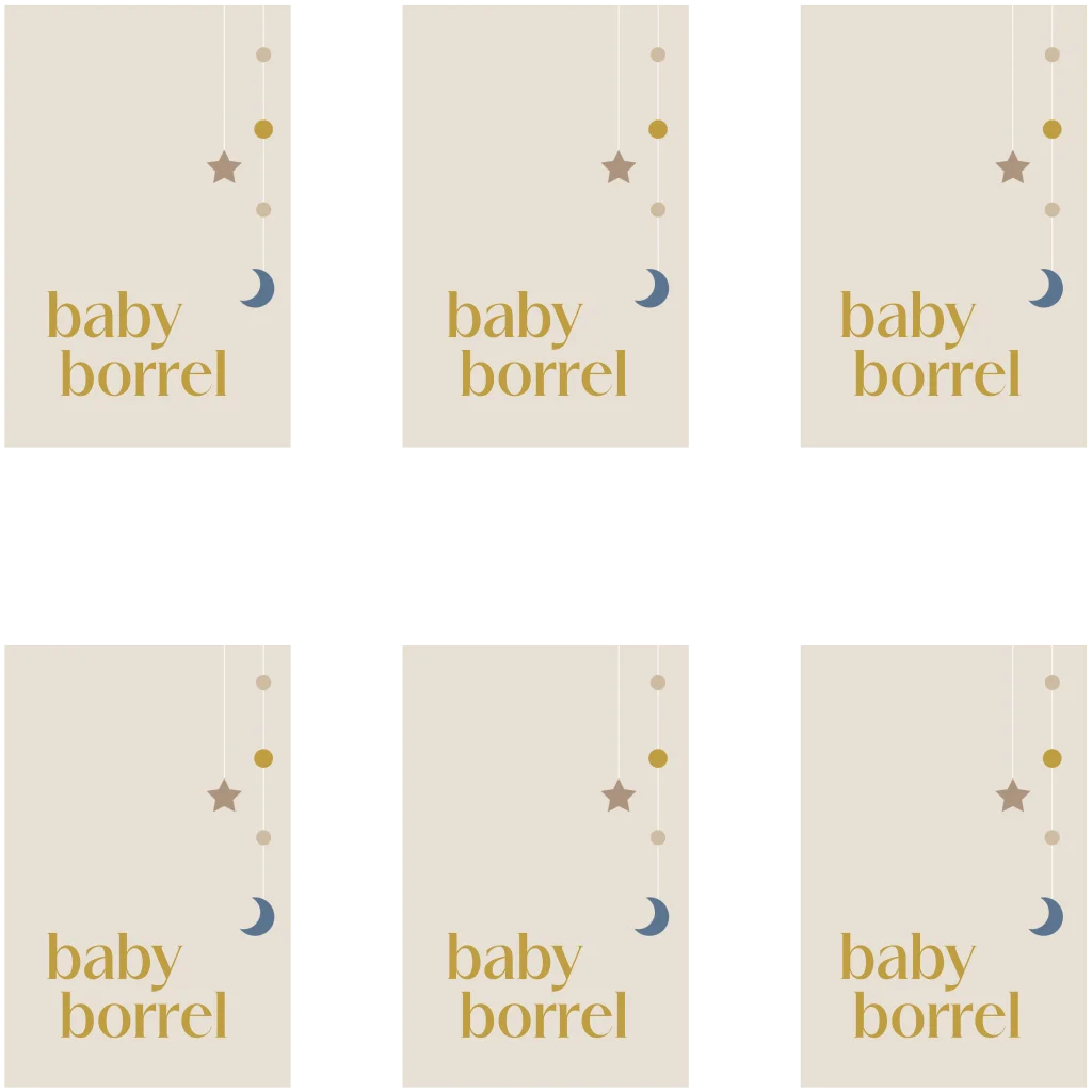Bewerk deze kraamborrelkaartjes naar eigen wens. Te bestellen per 6 stuks. Het formaat van de kaartjes is 5,5 x 8,5 cm.
