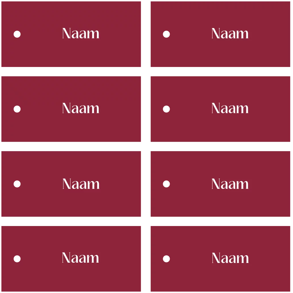 Creëer een prachtige tafelsetting door je menukaart en naamkaartjes in kleur op elkaar af te stemmen. Deze naamkaartjes hebben een formaat van 10 x 4,7 cm en zijn te bewerken naar eigen wens. Bevestig ze met een mooi lint of touwtje aan een wijnglas, het bestek, een servet of bijvoorbeeld aan de stoelen. Heb je hier hulp bij nodig? Stuur een berichtje, we helpen je graag verder!