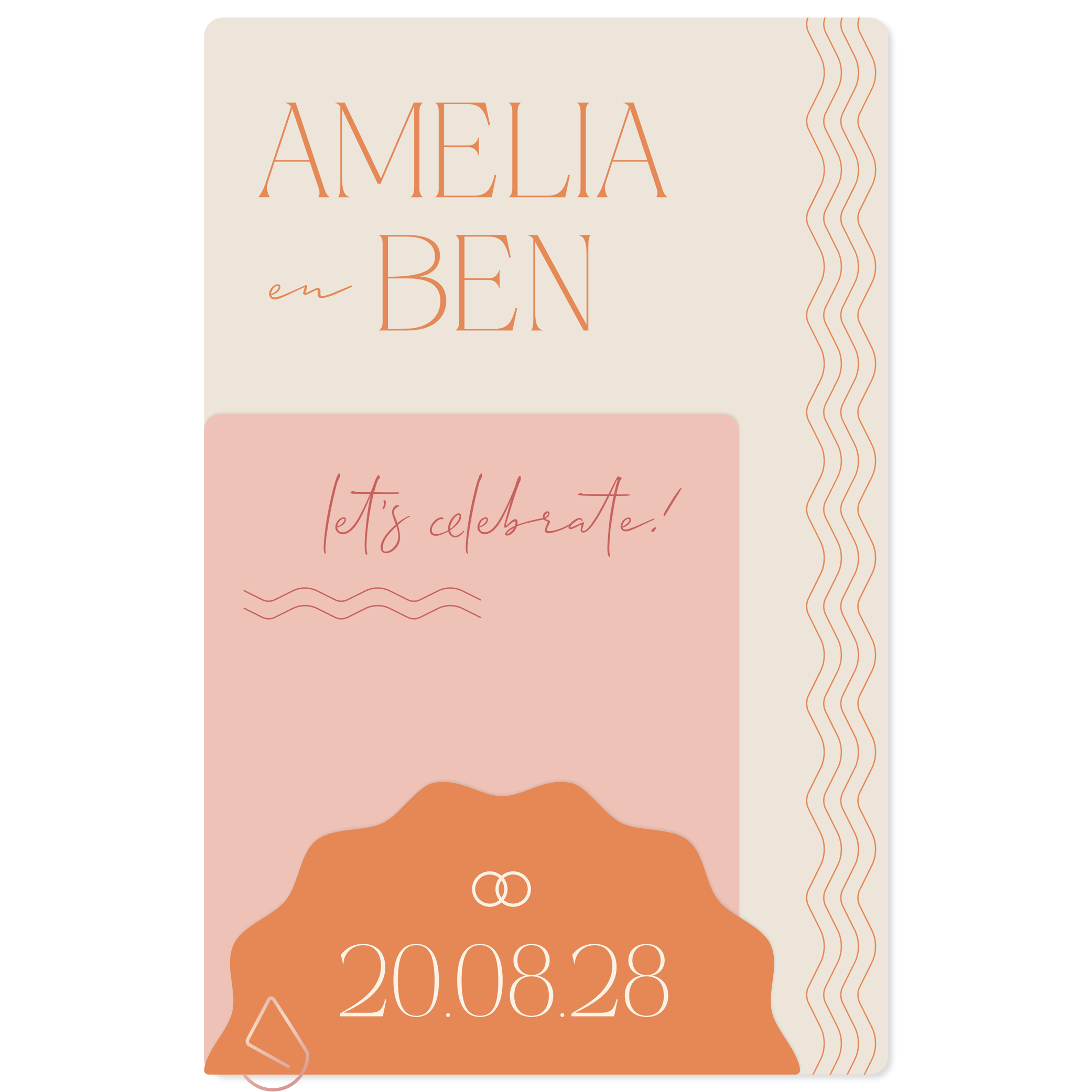 Kleurrijke stapel trouwkaart met speelse typografie. De grootste kaart heeft formaat 11x17 cm en past in een envelop met formaat 12x18 cm. Je kunt de achtergrond, het lettertype en kleuren naar eigen wens aanpassen. Bevestig de kaarten aan elkaar met een leuke paperclip. Hulp nodig bij het ontwerpen? Stuur een berichtje, we helpen je graag verder!