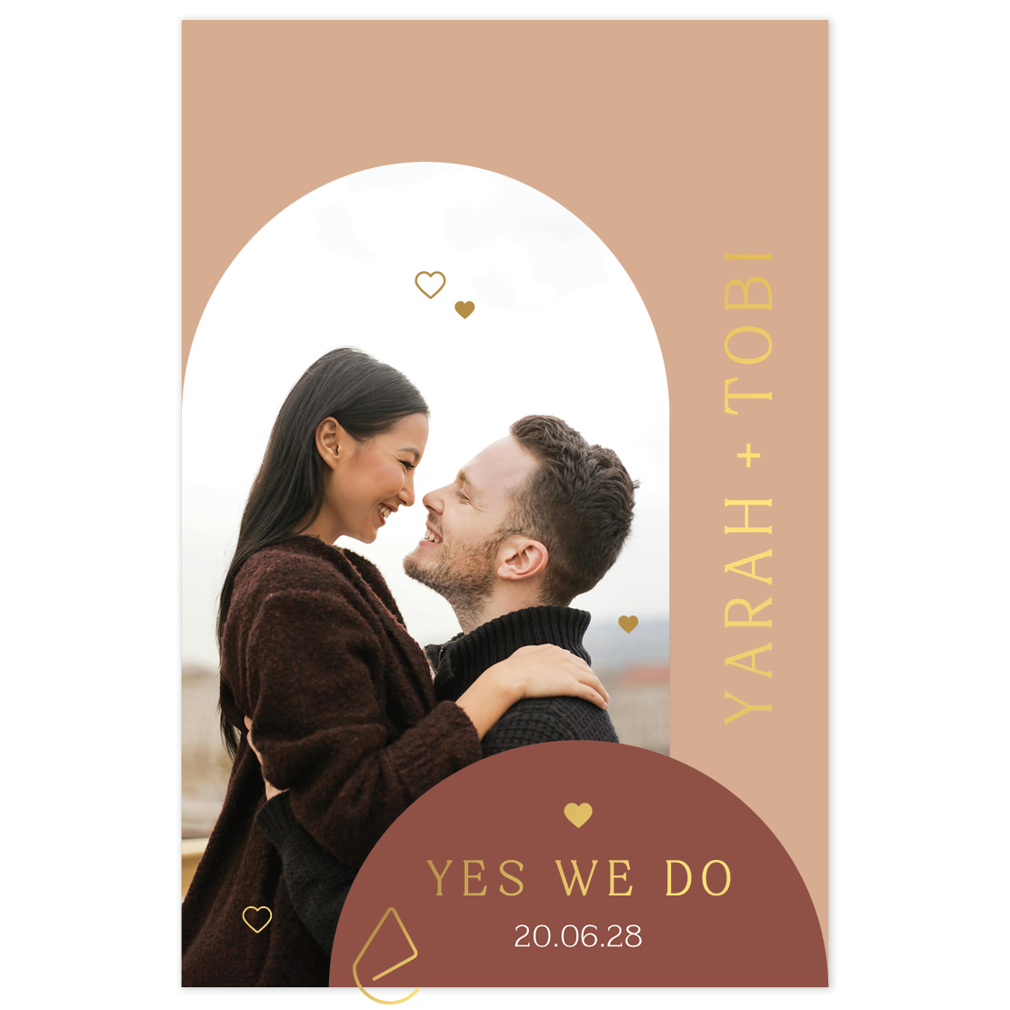 Een moderne stapel trouwkaart in terra tinten met foto en goudfolie. De grootste kaart heeft formaat 11x17 cm en past in een envelop met formaat 12x18 cm. Je kunt de achtergrond, het lettertype en kleuren naar eigen wens aanpassen. Bevestig de kaarten aan elkaar met een leuke paperclip. Hulp nodig bij het ontwerpen? Stuur een berichtje, we helpen je graag verder!