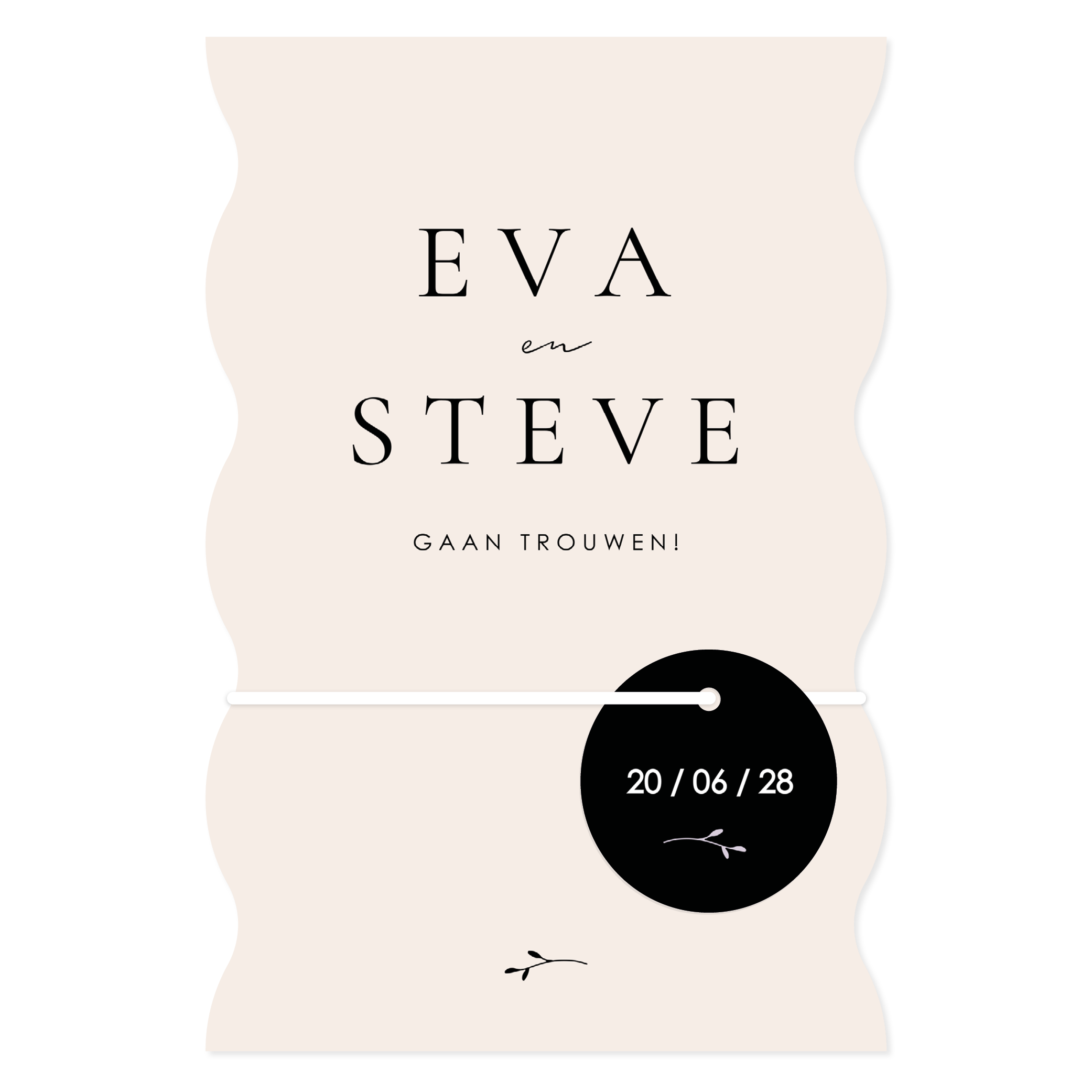 Trouwkaart in bijzondere vorm met rond label. De kaart heeft een formaat van 11x17 cm en past in een envelop met formaat 12x18 cm. Bind het label om de kaart met een mooi lint. Je kunt de achtergrond, het lettertype en kleuren naar eigen wens aanpassen. Hulp nodig bij het ontwerpen? Stuur een berichtje, we helpen je graag verder!